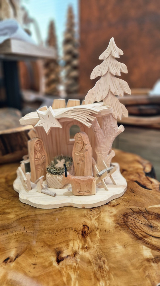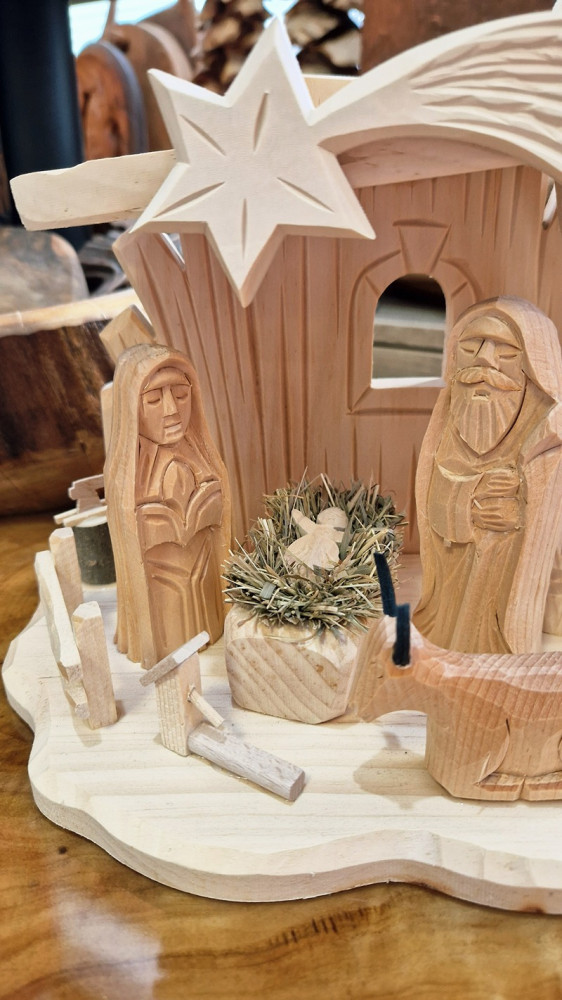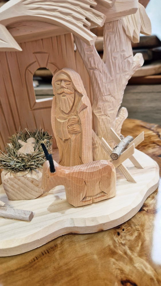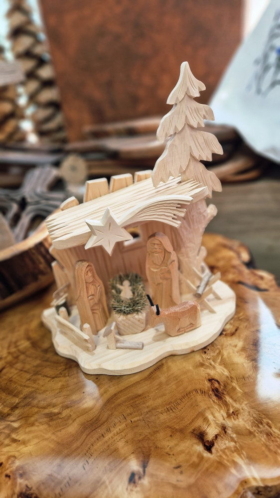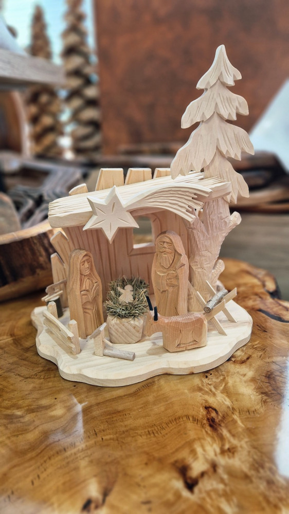 Drevený betlehem, precízne, ručne vyrezávaný s láskou a detailom. Každá figúrka, od Svätej rodiny po zvieratká a pastierov, je starostlivo vytvorená, aby vyrozprávala príbeh narodenia Krista s autentickým nádychom.