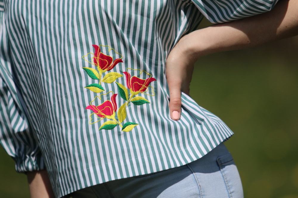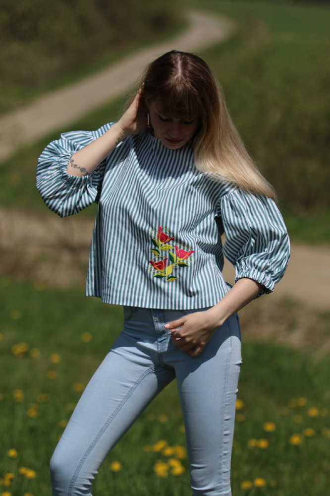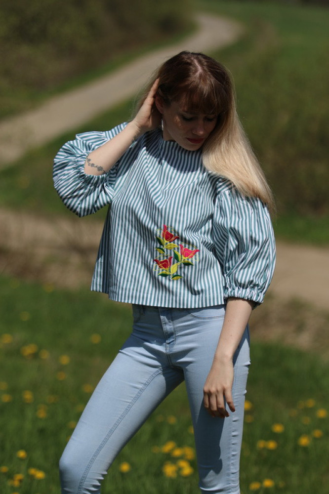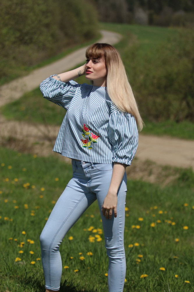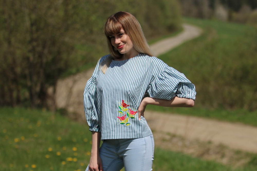 Vyšívaná bavlnená blúzka oversize strihu s nadčasovými puff rukávmi ukončenými do gumičky. Je pohodlná, veľmi jemná, ľahká, priedušná a vhodná na celoročné nosenie. Kombinovateľná ako k džínsom, tak aj k sukničke.