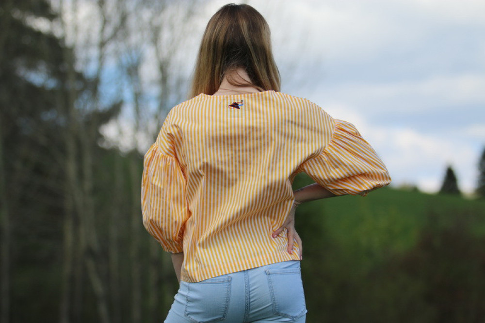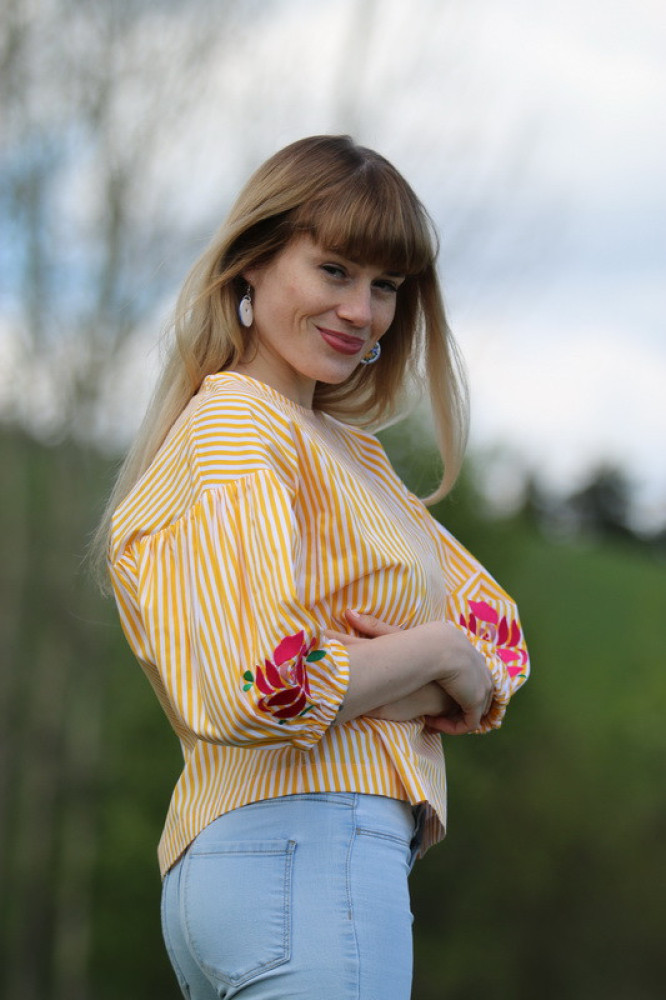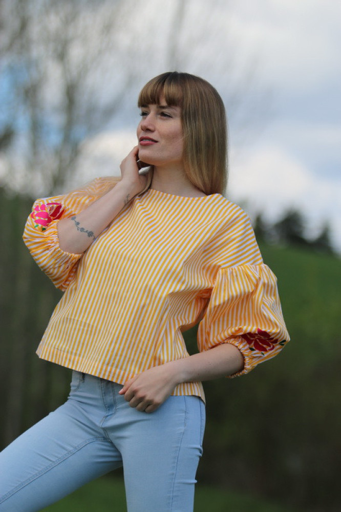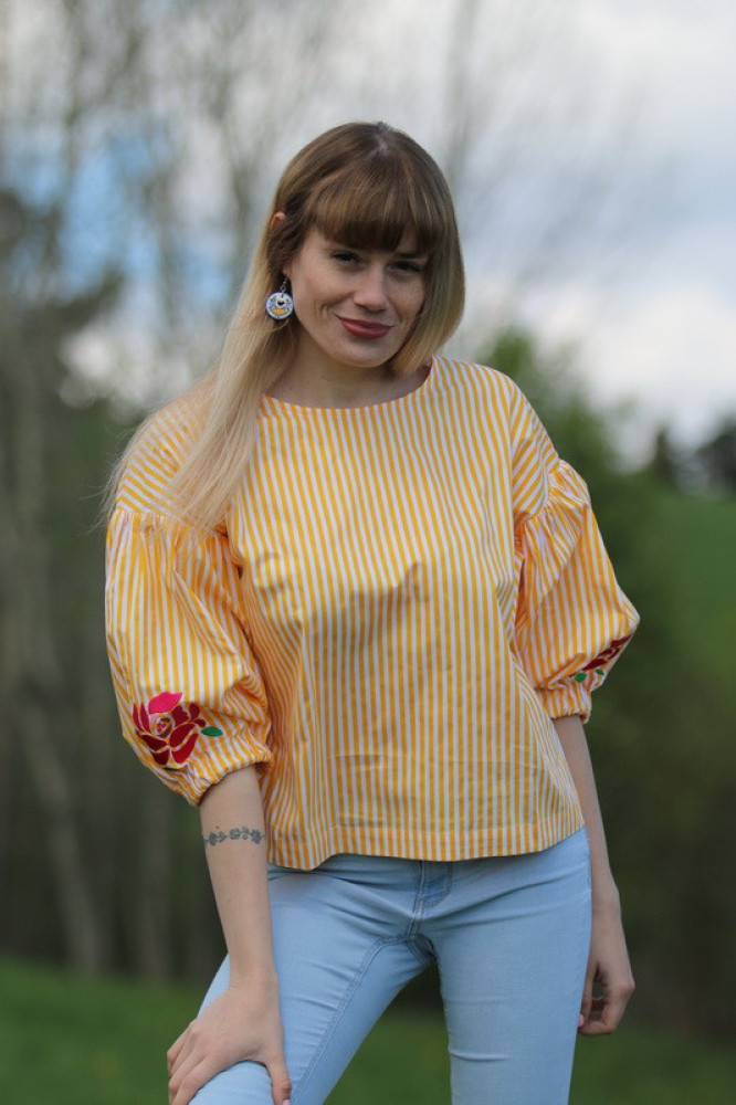Trendy pásik bavlnená blúzka oversize strihu s nadčasovými puff rukávmi ukončenými do gumičky. Je pohodlná, veľmi jemná, ľahká, priedušná a vhodná na celoročné nosenie. Kombinovateľná ako k džínsom, tak aj k sukničke.