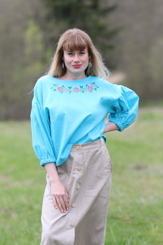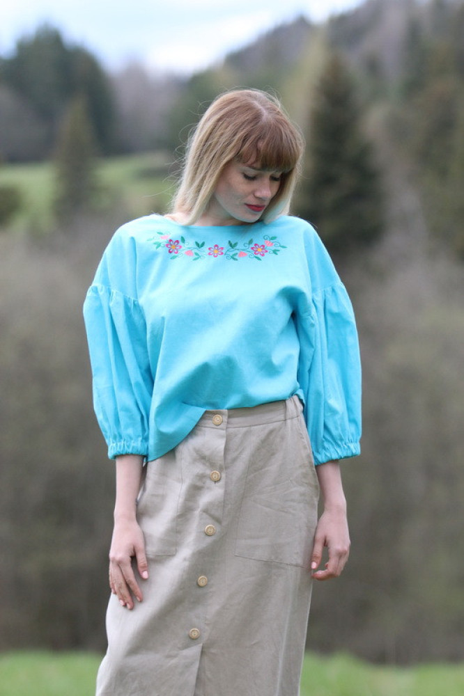 Moderný strih dopĺňajú výrazné balónové rukávy do gumičky, ktoré dodávajú outfitu eleganciu a originalitu. Na prednej strane sa nachádza decentná kvetinová výšivka, ktorá celkový vzhľad krásne oživuje.