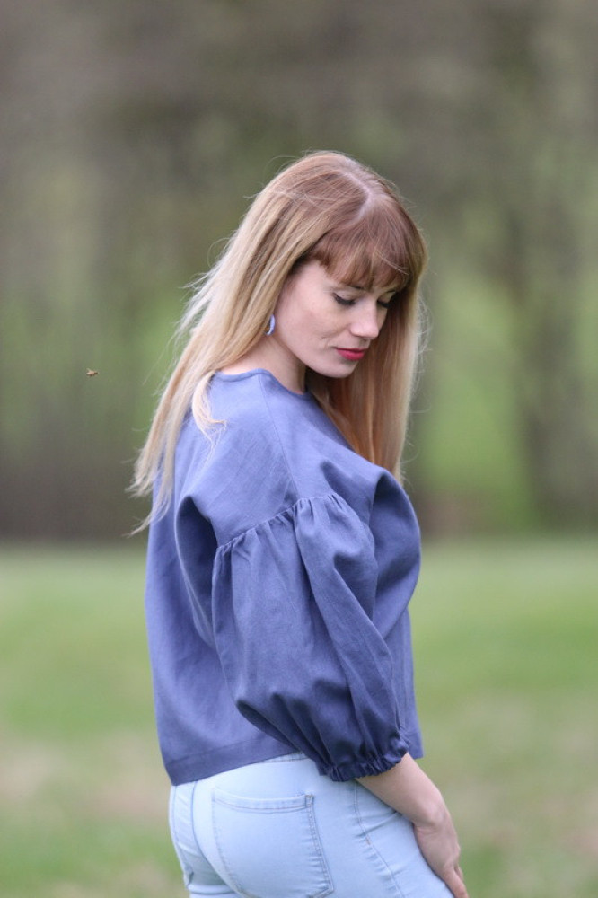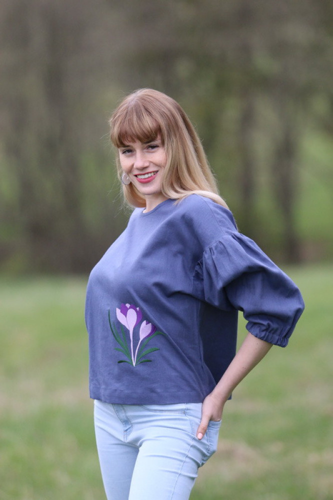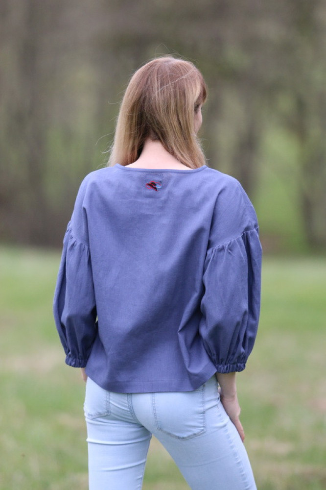 Vyšívaná ľanová blúzka oversize strihu s nadčasovými puff rukávmi ukončenými do gumičky. Je pohodlná, veľmi jemná, ľahká, priedušná a vhodná na celoročné nosenie. Kombinovateľná ako k džínsom, tak aj k sukničke.