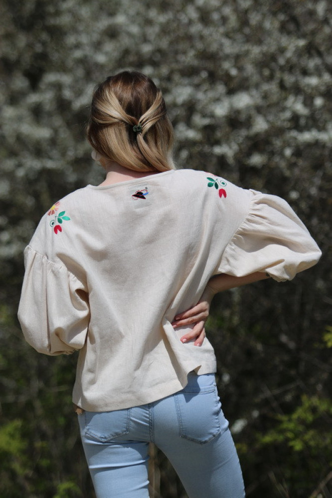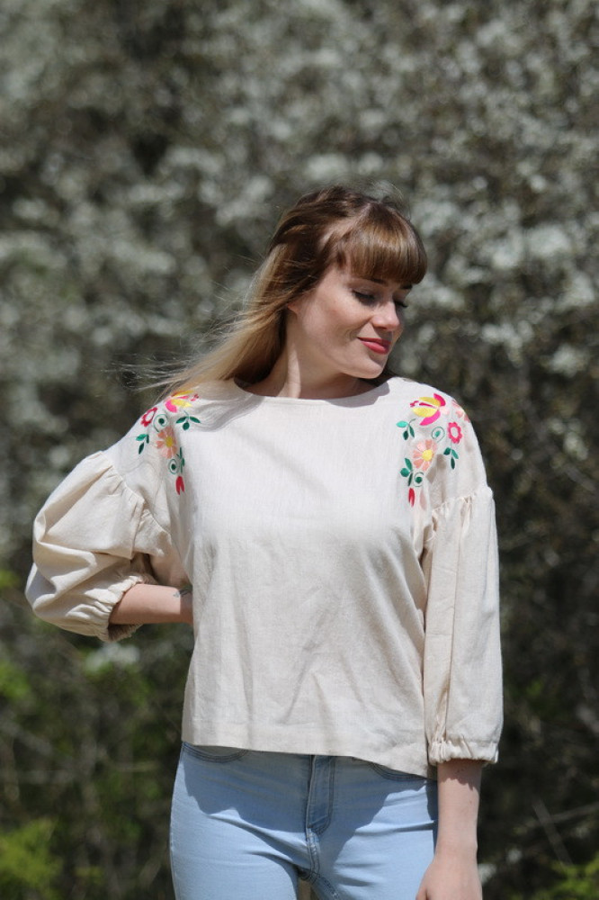 Vyšívaná ľanová blúzka oversize strihu s nadčasovými puff rukávmi ukončenými do gumičky. Je pohodlná, veľmi jemná, ľahká, priedušná a vhodná na celoročné nosenie. Kombinovateľná ako k džínsom, tak aj k sukničke.