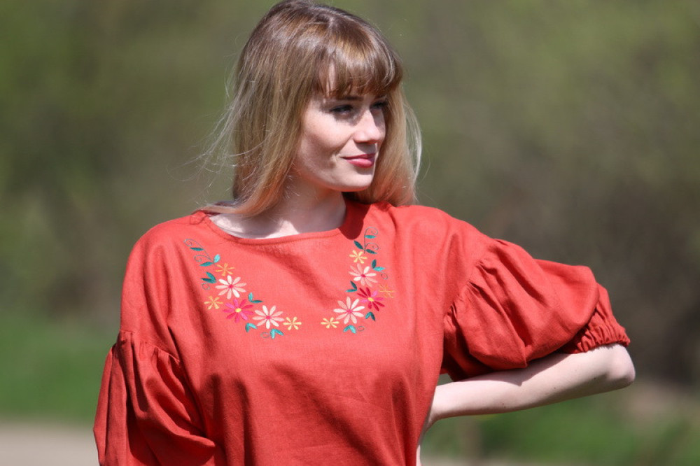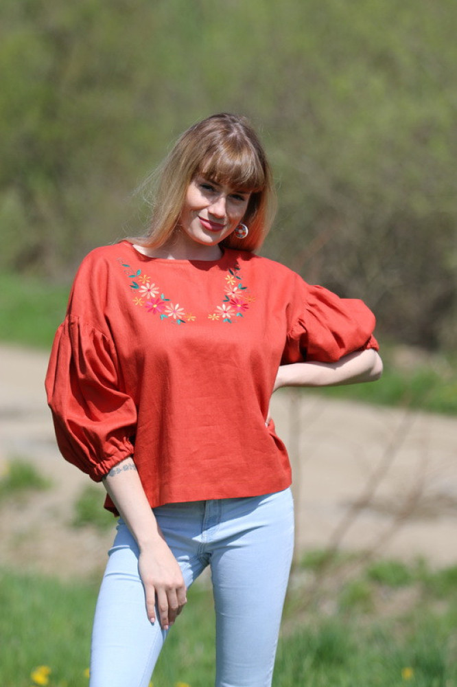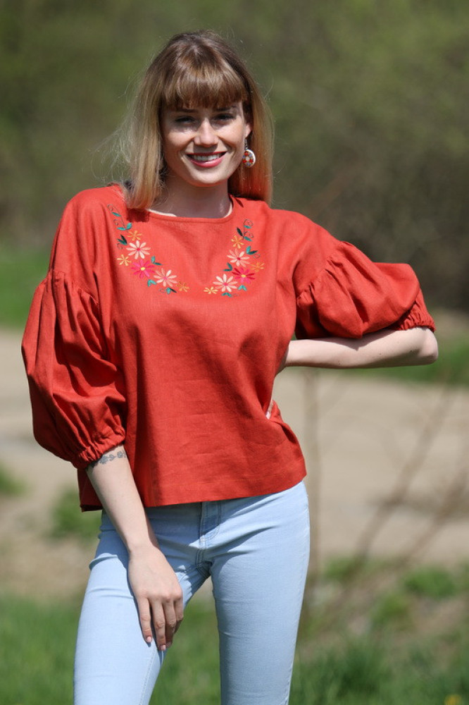 Táto ľanová blúzka s kvetinovou výšivkou je ideálnou voľbou pre ženy, ktoré hľadajú priedušné letné oblečenie z prírodných materiálov.