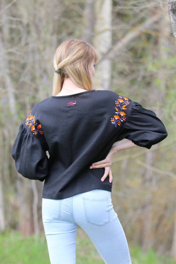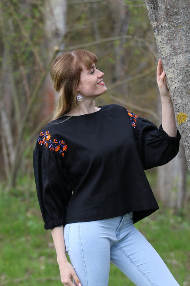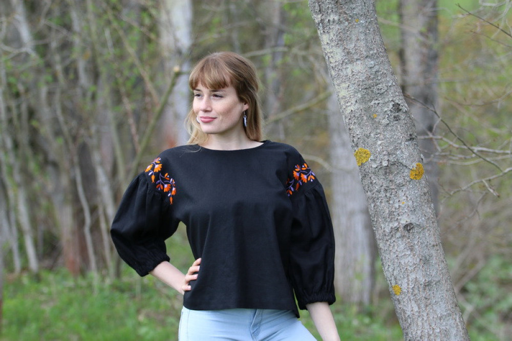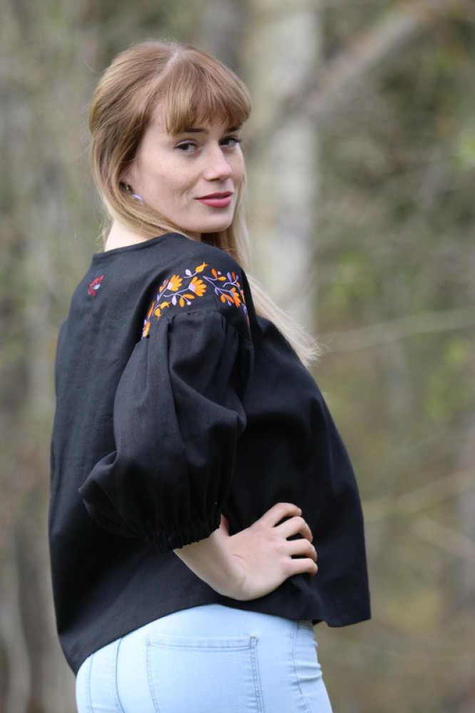 Vyšívaná ľanová blúzka oversize strihu s nadčasovými puff rukávmi ukončenými do gumičky. Je pohodlná, veľmi jemná, ľahká, priedušná a vhodná na celoročné nosenie. Kombinovateľná ako k džínsom, tak aj k sukničke.