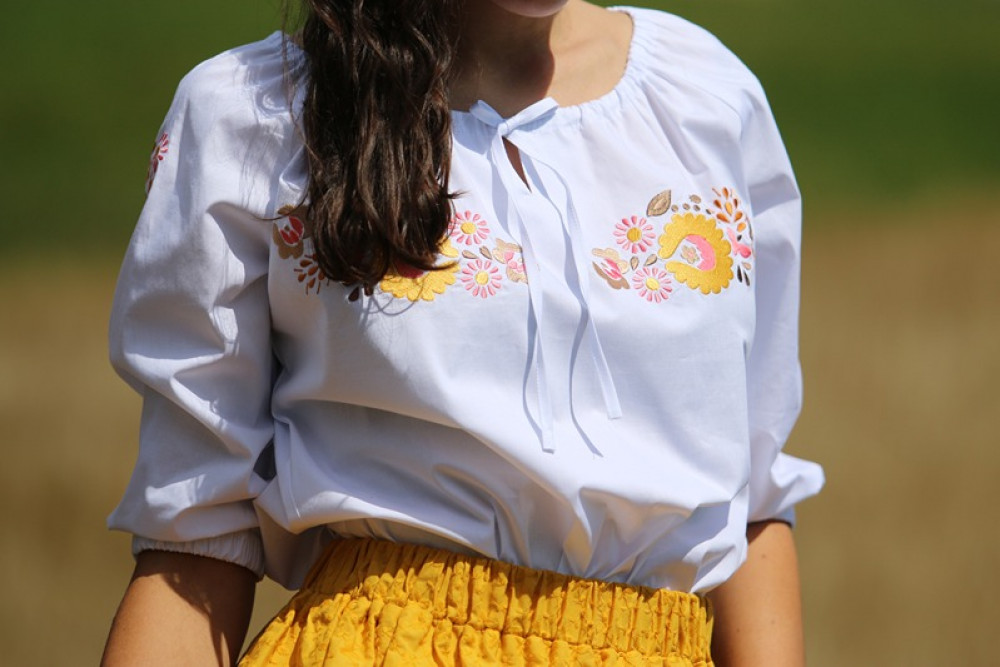 Táto vyšívaná bavlnená ľudová blúzka značky Krojove.sk v sebe spája tradičný folklór a moderný nadčasový dizajn. Blúzka má puff rukávy ukončené do gumičky a oversize strih, vďaka ktorému sa prispôsobí každej postave a poskytne maximálne pohodlie počas celého dňa.