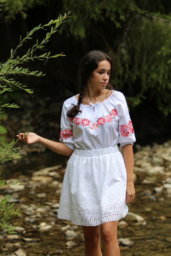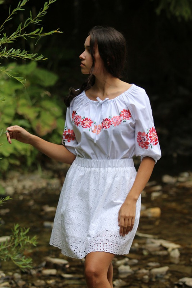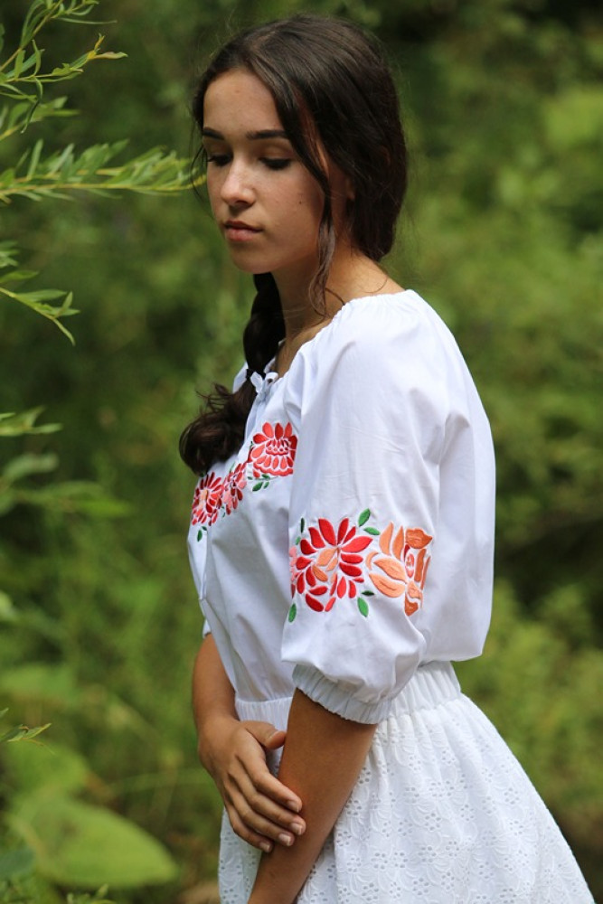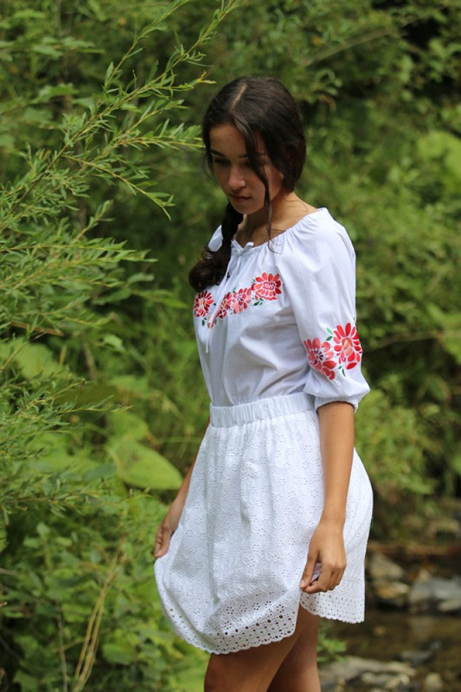 Táto vyšívaná bavlnená ľudová blúzka značky Krojove.sk v sebe spája tradičný folklór a moderný nadčasový dizajn. Blúzka má puff rukávy ukončené do gumičky a oversize strih, vďaka ktorému sa prispôsobí každej postave a poskytne maximálne pohodlie počas celého dňa.