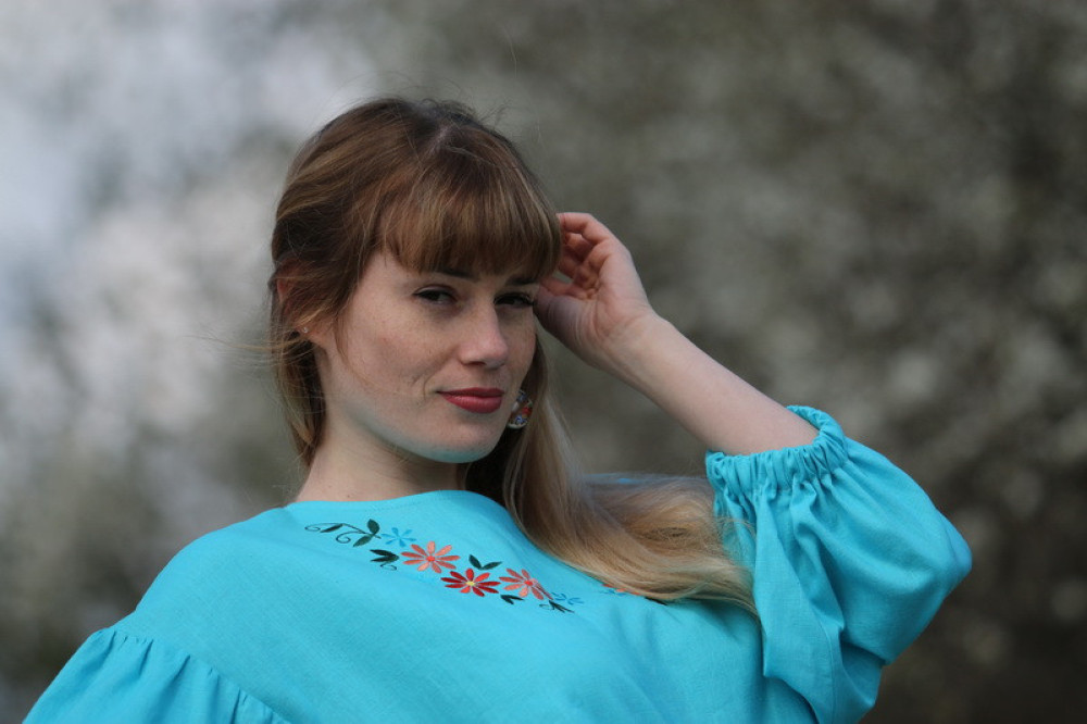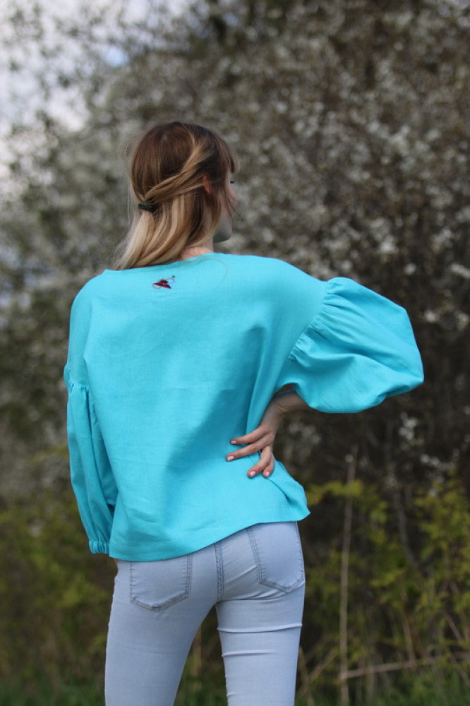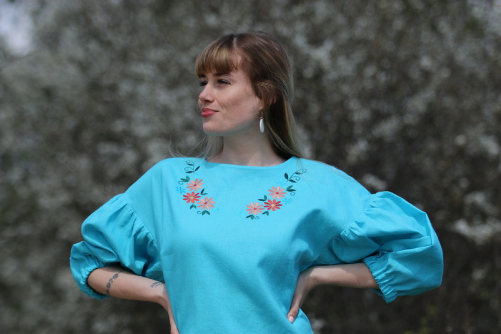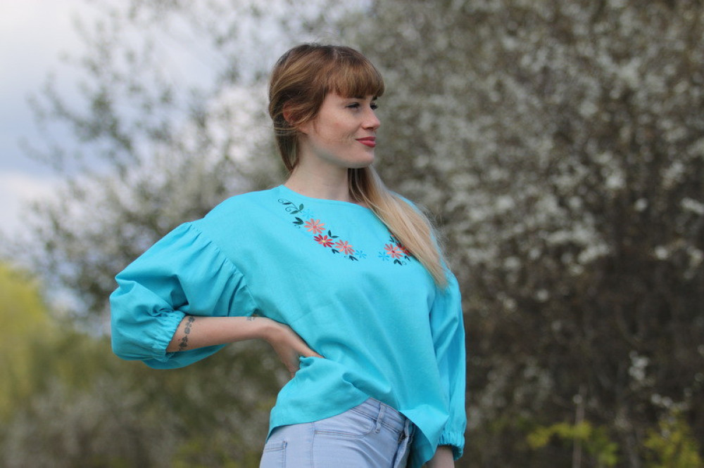 Vyšívaná ľanová blúzka oversize strihu s nadčasovými puff rukávmi ukončenými do gumičky. Je pohodlná, veľmi jemná, ľahká, priedušná a vhodná na celoročné nosenie. Kombinovateľná ako k džínsom, tak aj k sukničke.