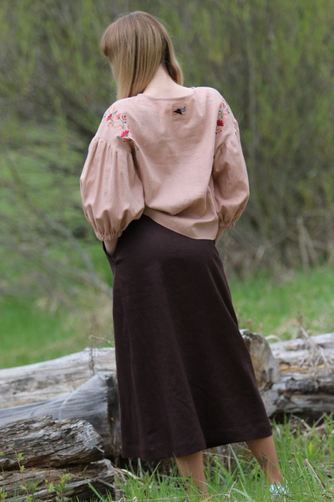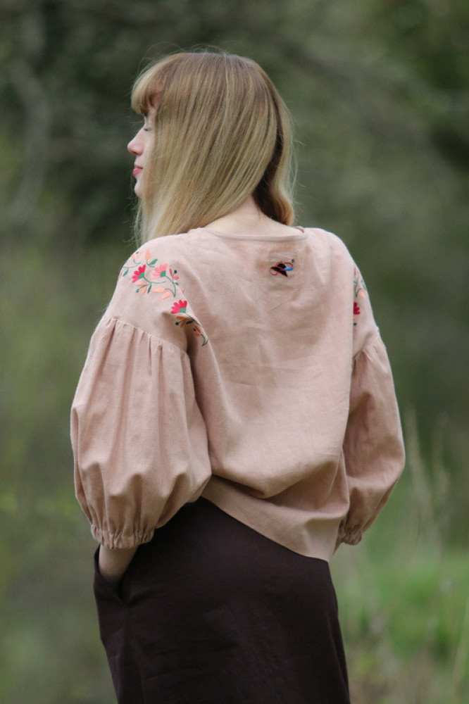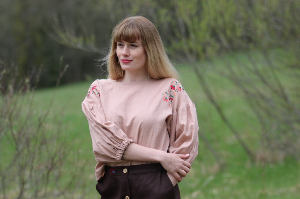 Vyšívaná ľanová blúzka oversize strihu s nadčasovými puff rukávmi ukončenými do gumičky. Je pohodlná, veľmi jemná, ľahká, priedušná a vhodná na celoročné nosenie. Kombinovateľná ako k džínsom, tak aj k sukničke.