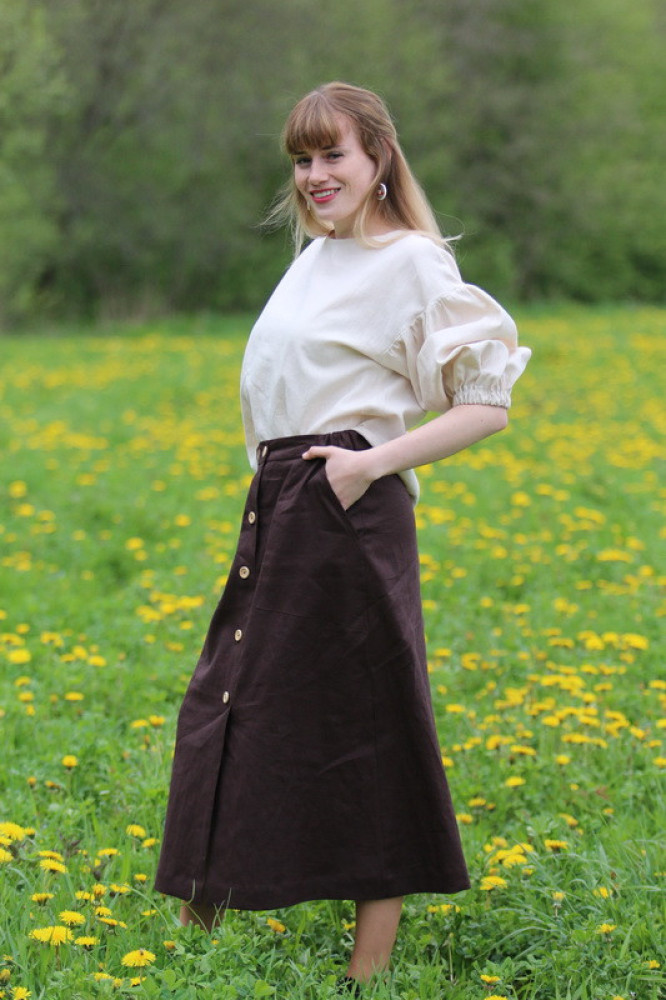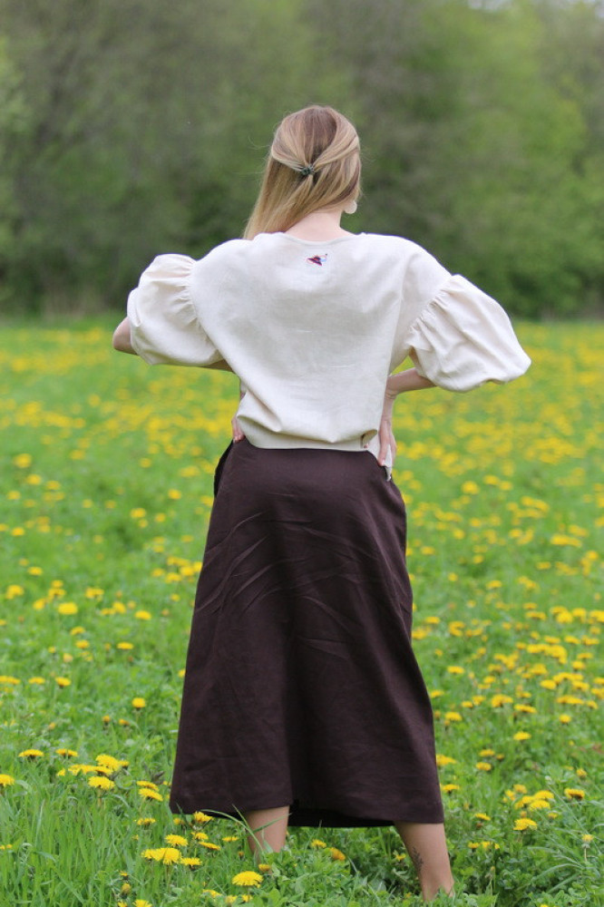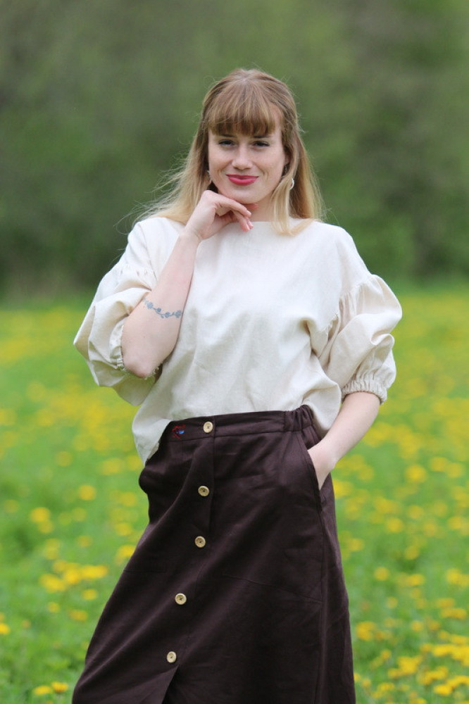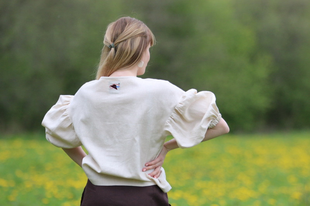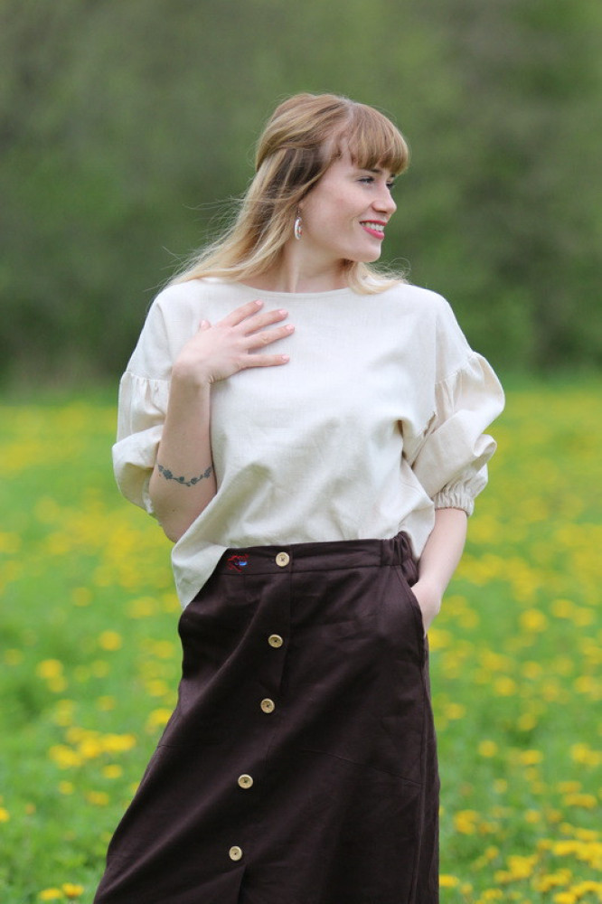 Ľanová blúzka oversize strihu s nadčasovými puff rukávmi ukončenými do gumičky. Je pohodlná, veľmi jemná, ľahká, priedušná a vhodná na celoročné nosenie. Kombinovateľná ako k džínsom, tak aj k sukničke.