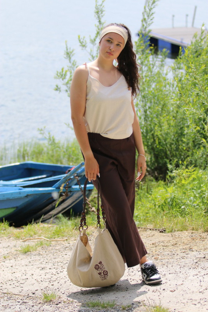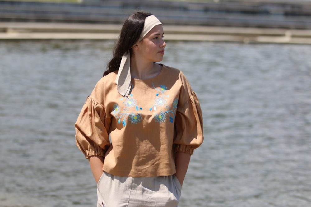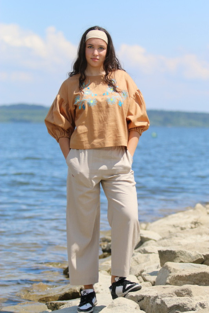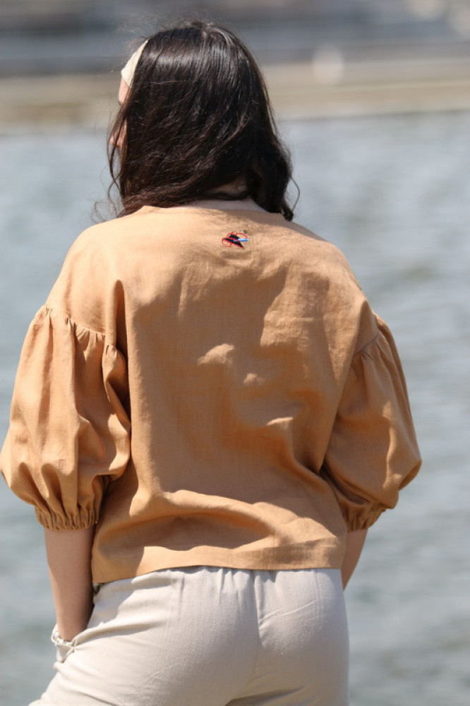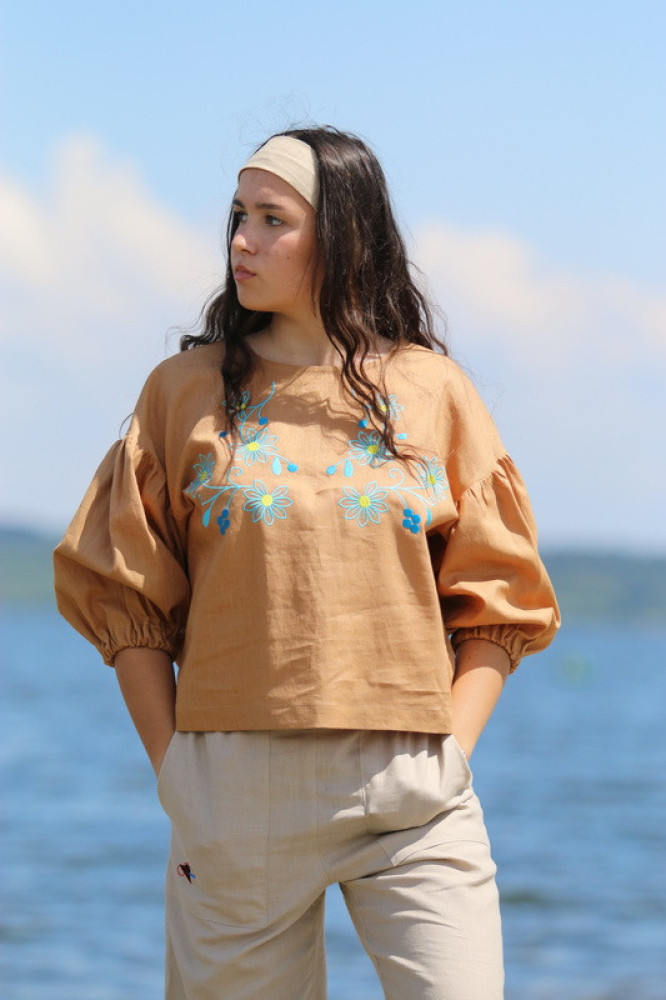 Vyšívaná ľanová blúzka oversize strihu s nadčasovými puff rukávmi ukončenými do gumičky. Je pohodlná, veľmi jemná, ľahká, priedušná a vhodná na celoročné nosenie. Kombinovateľná ako k džínsom, tak aj k sukničke.