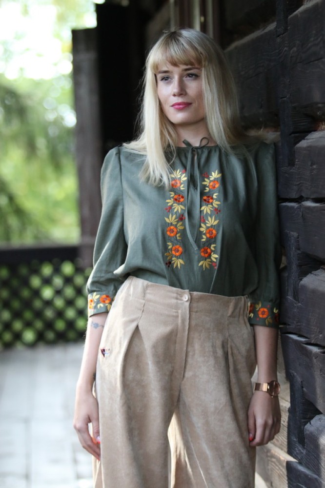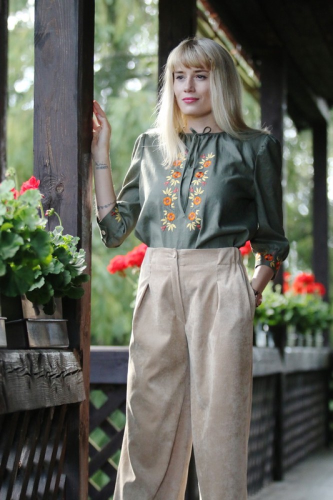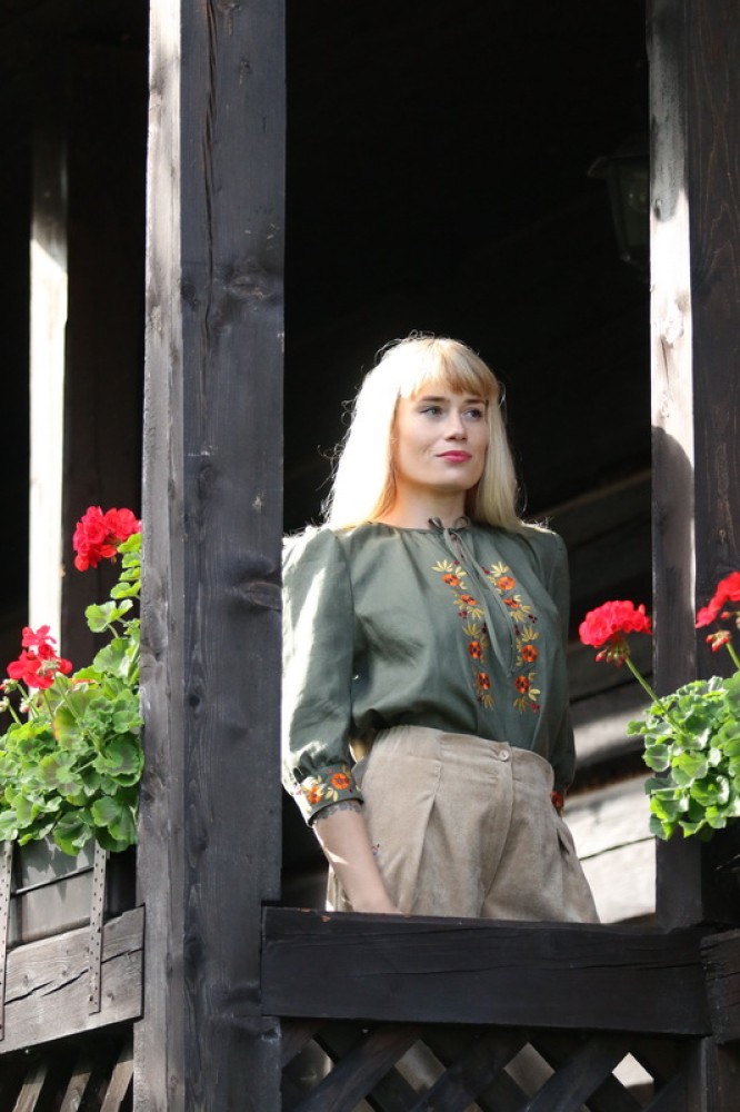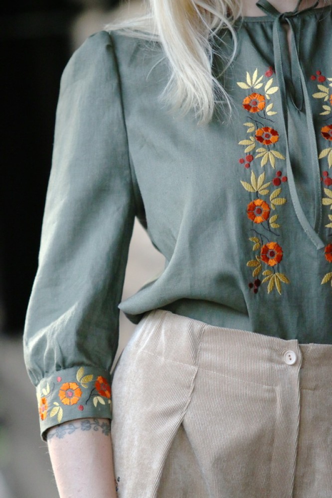 Vyšívaná ľanová blúzka s 3/4 rukávmi ukončenými manžetou. Pôsobí elegantne a sviežo. Je pohodlná, veľmi jemná, ľahká, priedušná a vhodná na celoročné nosenie. Kombinovateľná ako k nohaviciam i k sukni.