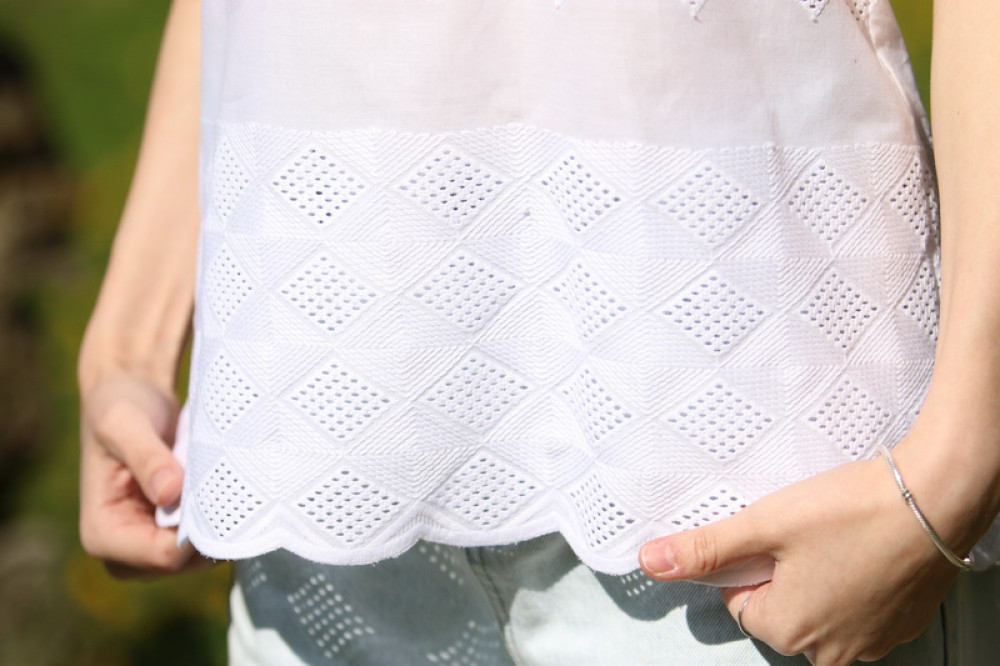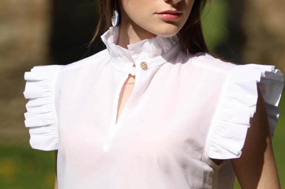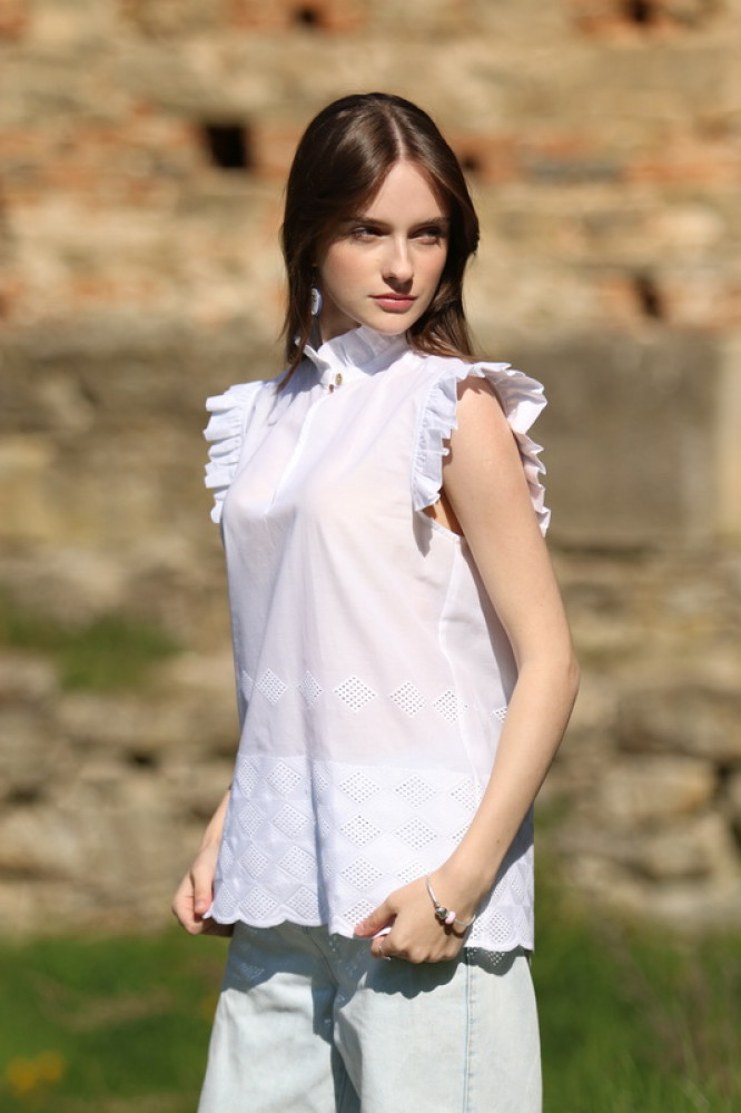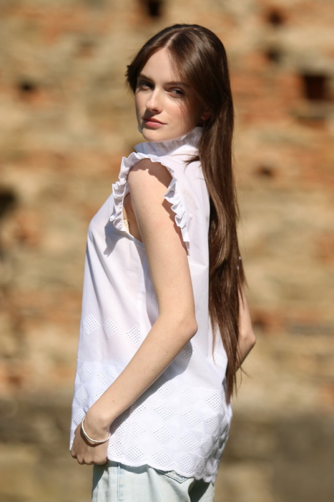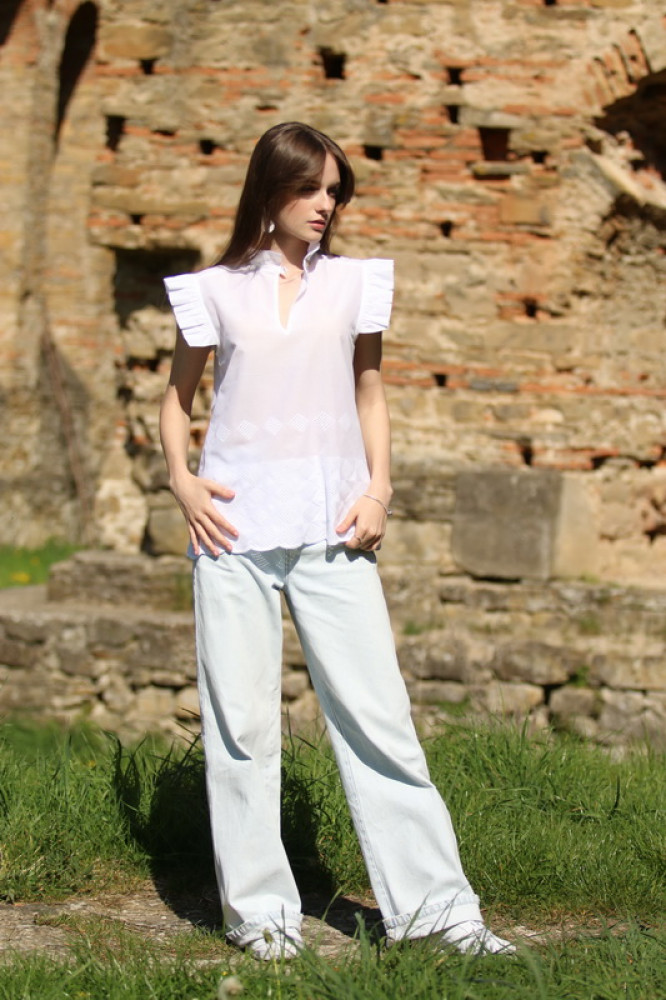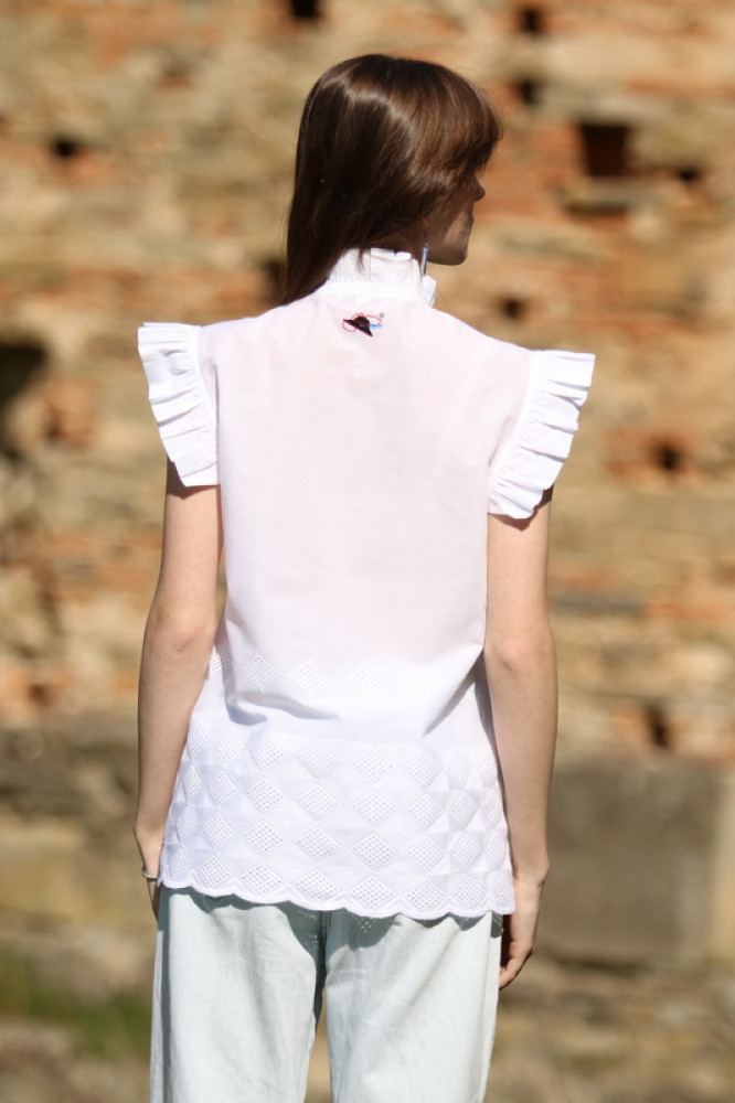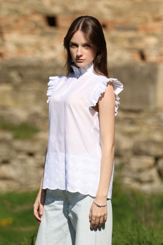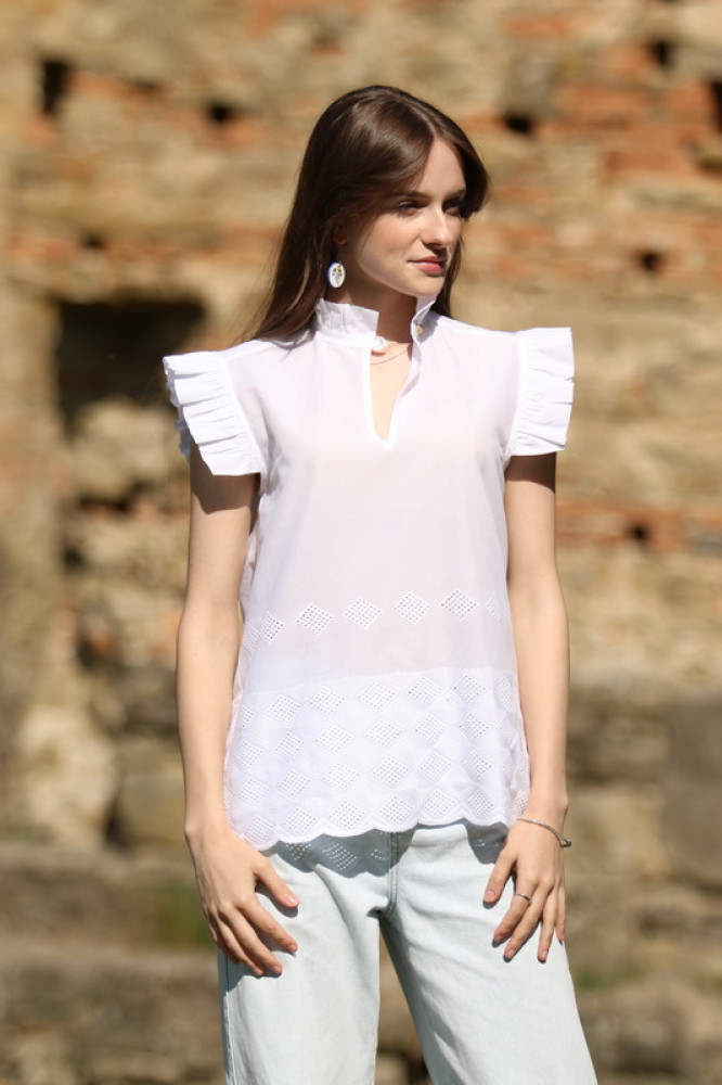 Bavlnená blúzka so stojačikom, ukončená romantickou madeirou. Pôsobí elegantne a romanticky. Je pohodlná, veľmi jemná, ľahká, priedušná a vhodná na celoročné nosenie. Kombinovateľná ako k nohaviciam i k sukni.