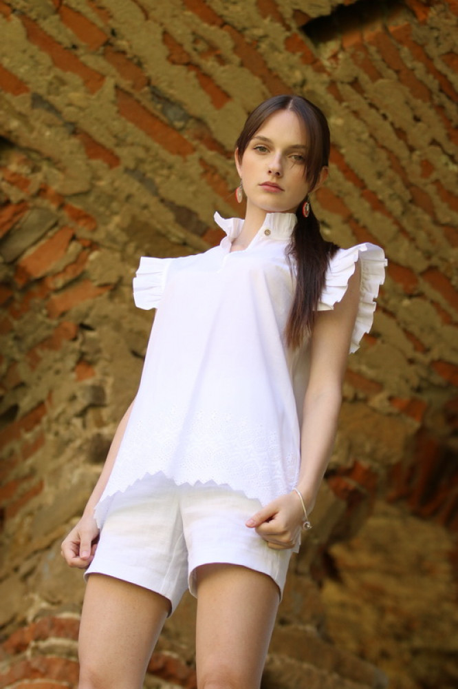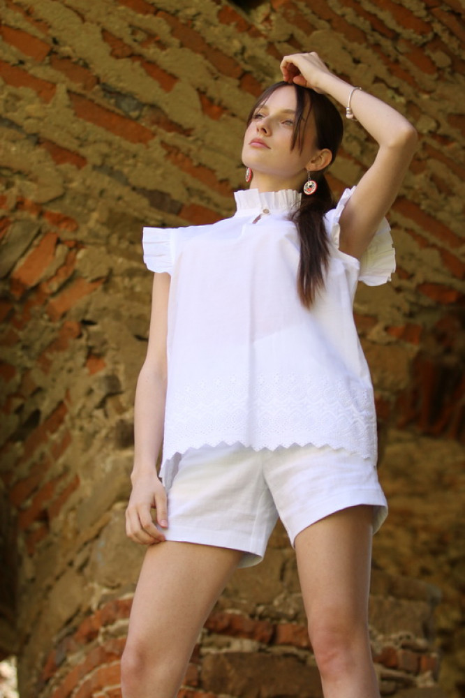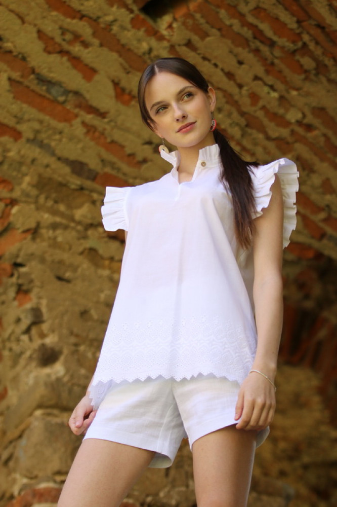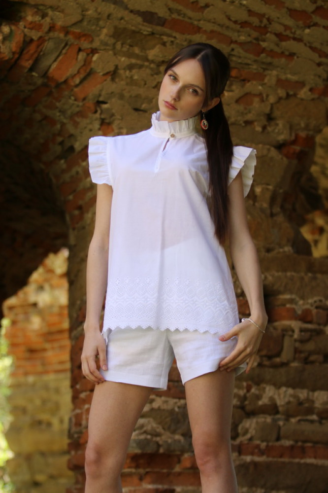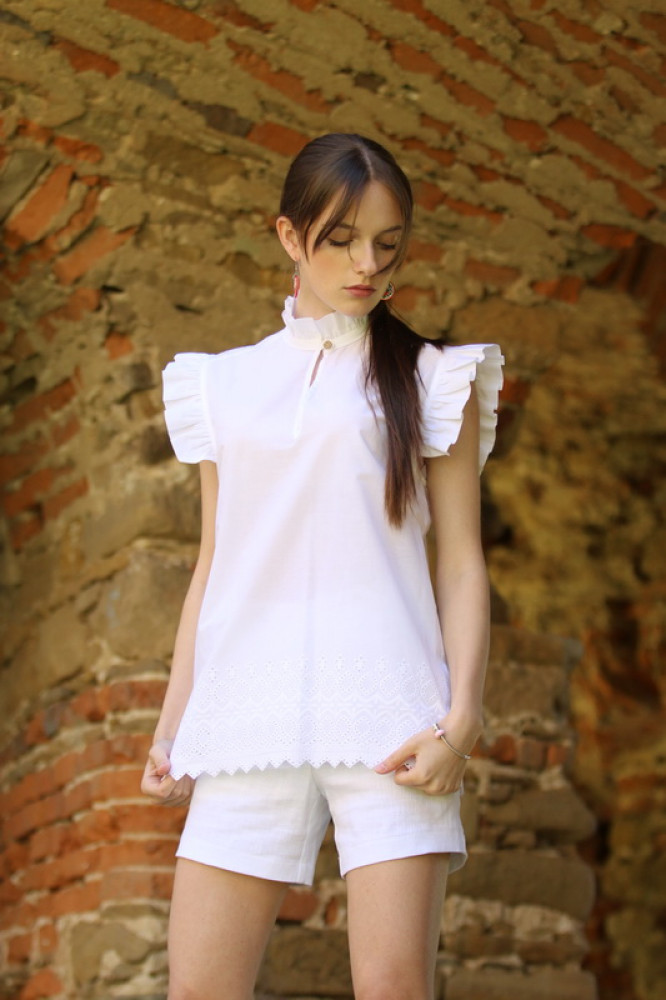 Bavlnená blúzka so stojačikom, ukončená romantickou madeirou. Pôsobí elegantne a romanticky. Je pohodlná, veľmi jemná, ľahká, priedušná a vhodná na celoročné nosenie. Kombinovateľná ako k nohaviciam i k sukni.