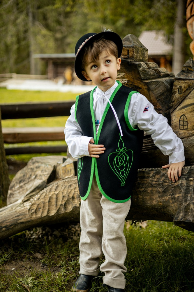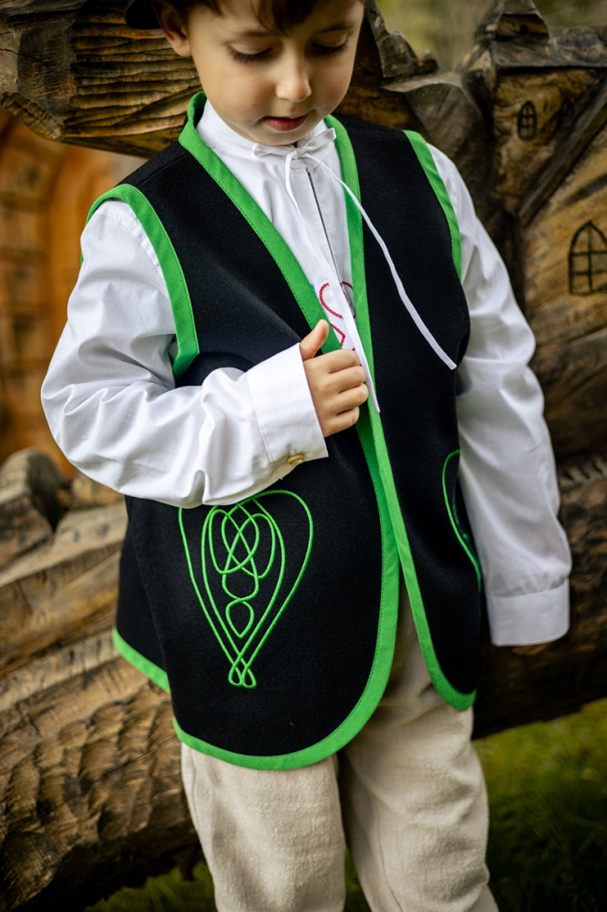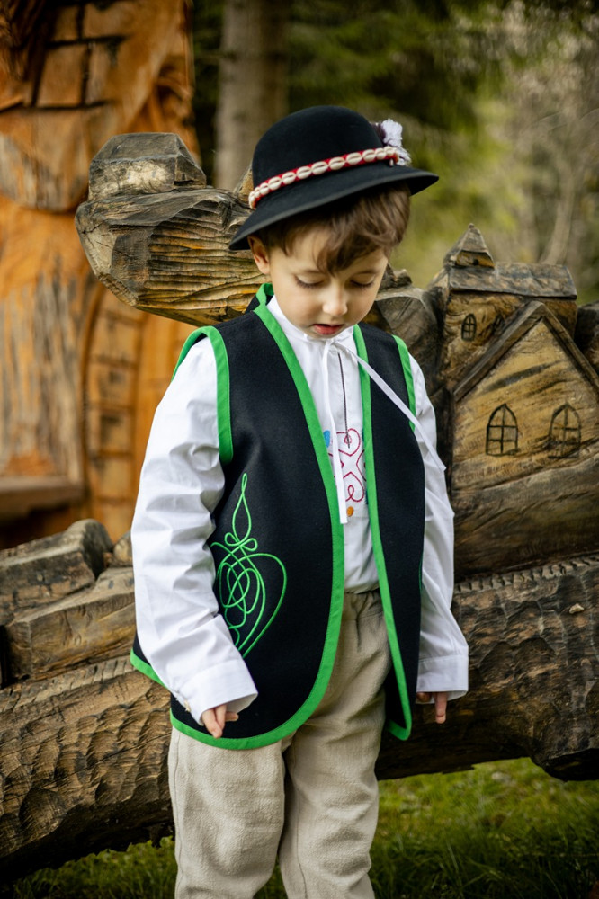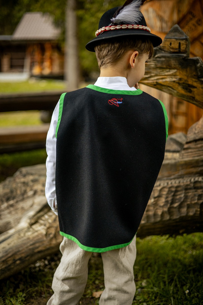 Štýlová chlapčenská ľudová vesta Krojove.sk je inšpirovaná tradičným slovenským krojom a prepracovaná do detailov. Čierna látka s kontrastným zeleným lemovaním a originálnou výšivkou dodáva každému malému junákovi výnimočný vzhľad. Vesta je ušitá z kvalitného materiálu, ktorý je pohodlný na nosenie a drží svoj tvar.