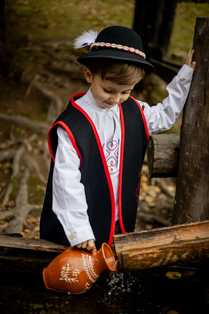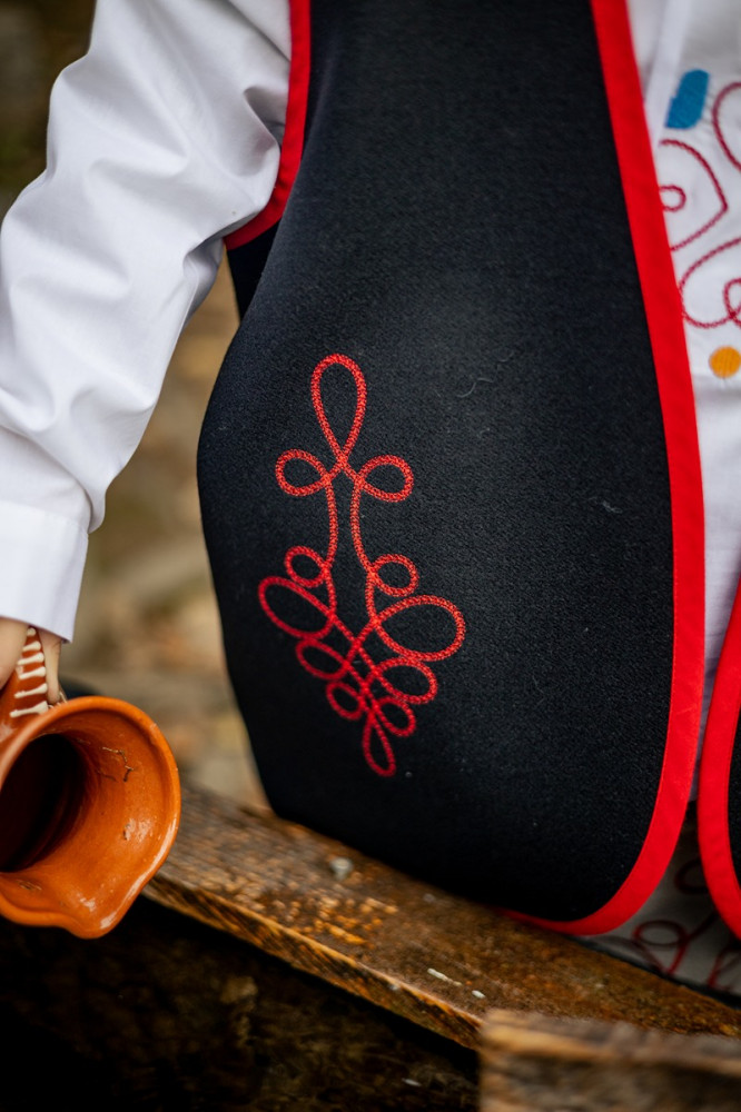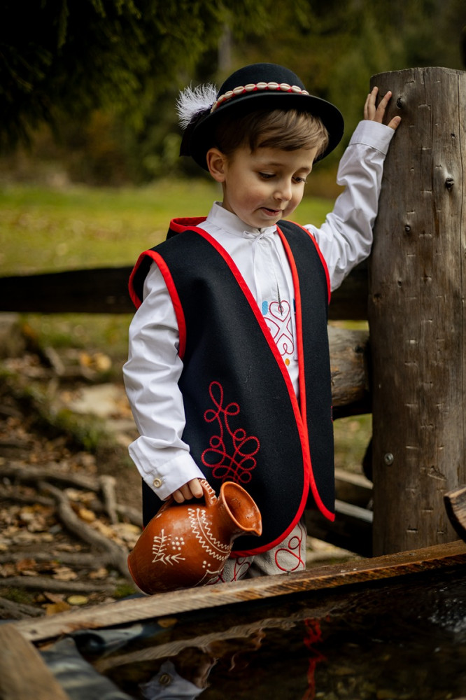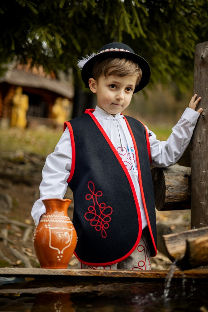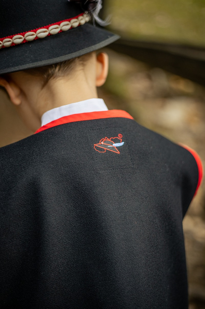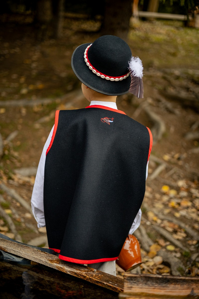 Štýlová chlapčenská ľudová vesta Krojove.sk je inšpirovaná tradičným slovenským krojom a prepracovaná do detailov. Čierna látka s kontrastným červeným lemovaním a originálnou výšivkou dodáva každému malému junákovi výnimočný vzhľad. Vesta je ušitá z kvalitného materiálu, ktorý je pohodlný na nosenie a drží svoj tvar.