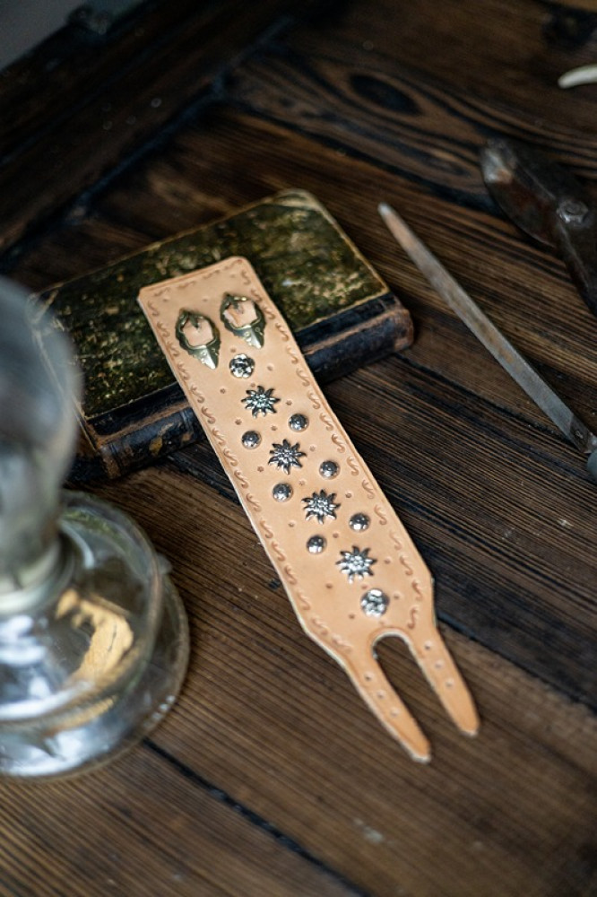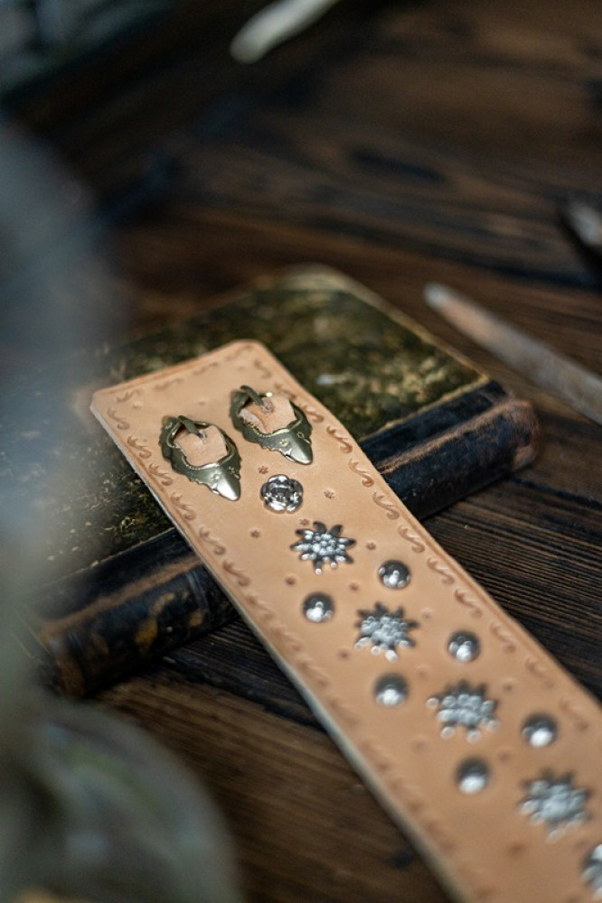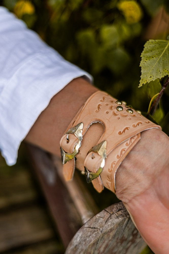 Vďaka nastaviteľným remienkom so sponami sa pohodlne prispôsobí zápästiu. Kovové ozdoby a ručne razené detaily dodávajú náramku autentický, ľudovo-inšpirovaný charakter.