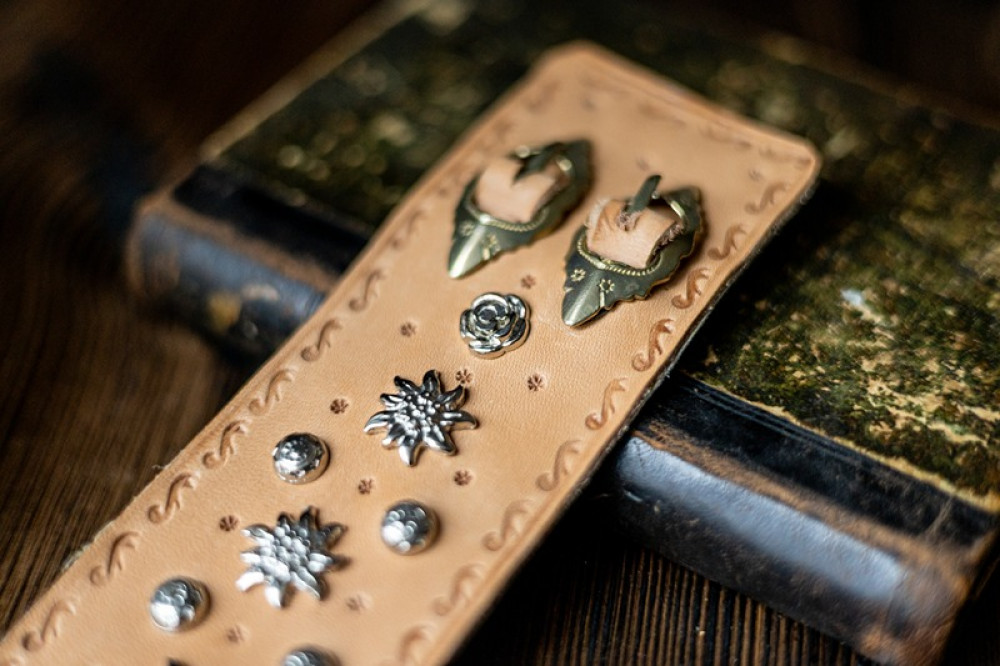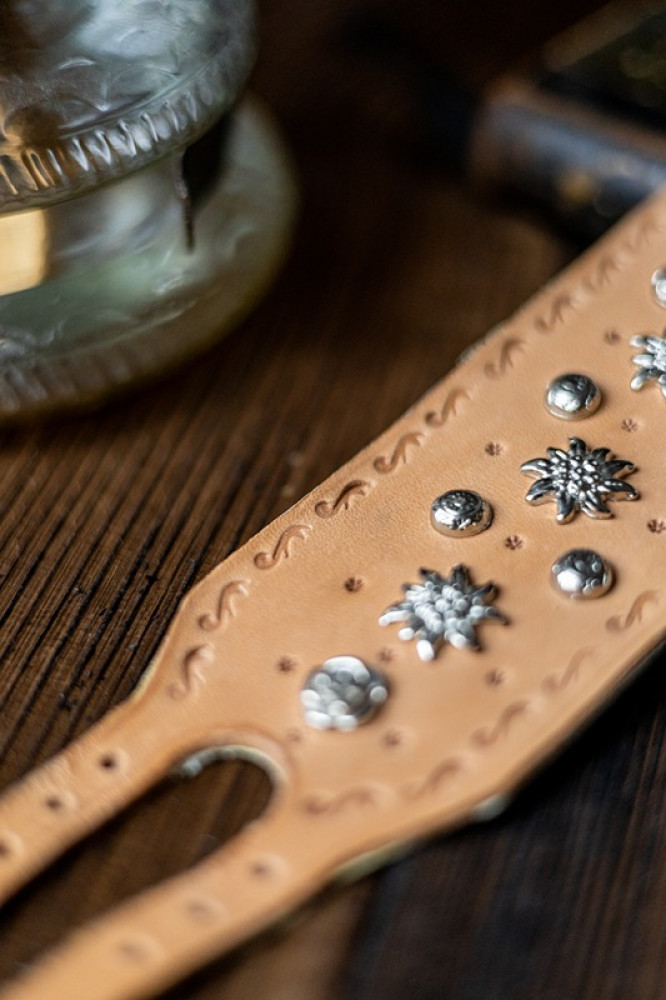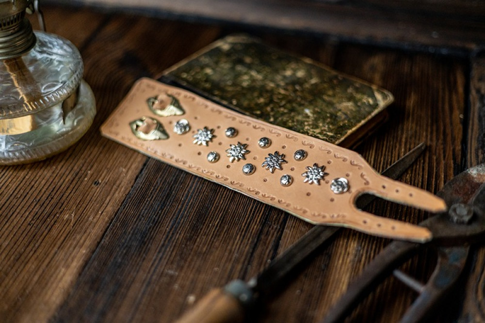 Tento poctivo ručne vyrábaný zápästník z prírodnej kože spája tradičné remeslo s jedinečným dizajnom. Každý kus je zdobený precíznou rytinou a kovovými prvkami, ktoré pripomínajú horské kvety a prírodu. Dominantou je reliéf kvetu plesnivca v strede, symbol sily a čistoty.
