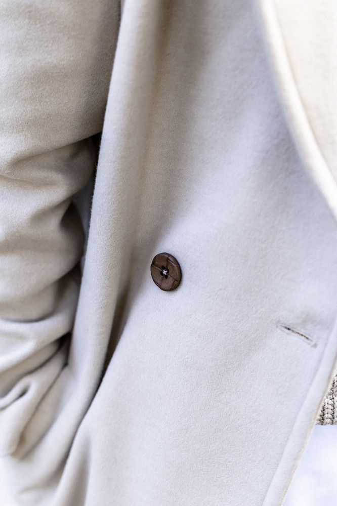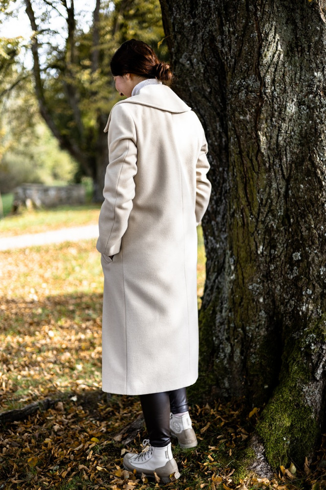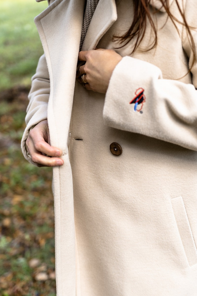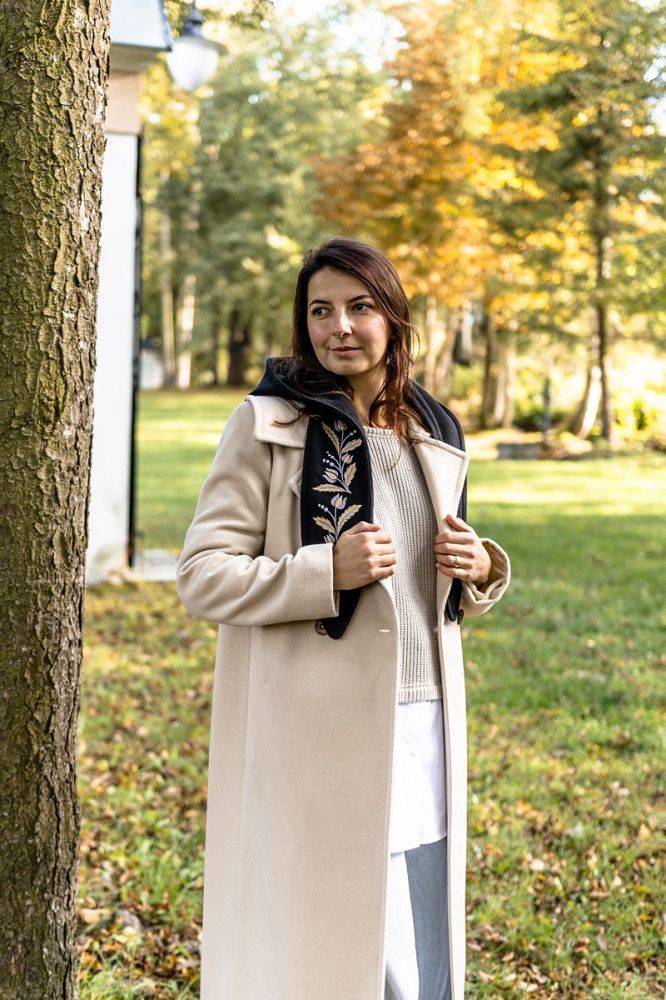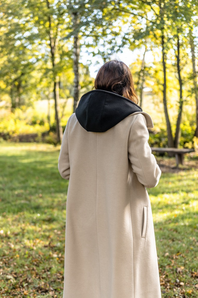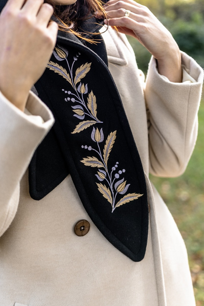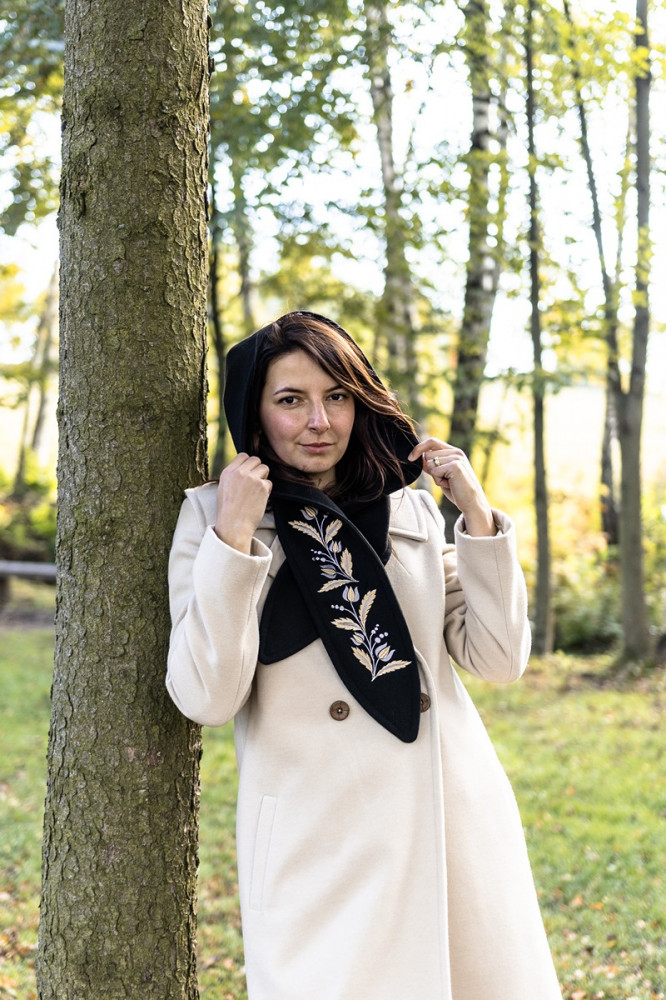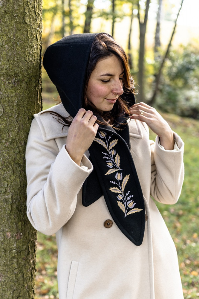 Jednoduchý elegantný kabát môžete doplniť obojstrannou kapucňou, ktorá je z jednej strany vyšívaná a z druhej čistá. Vďaka tomu môžete každý deň nosiť iný kabát.