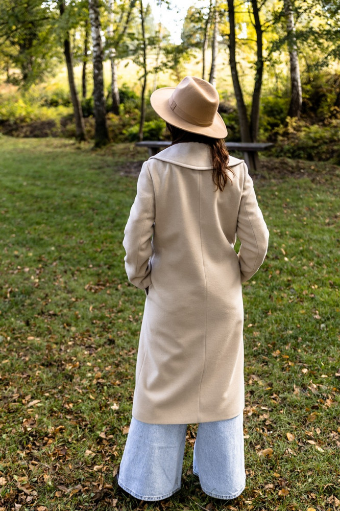 Dlhý béžový kabát s osobitnou vyšívanou kapucňou Jemnosť