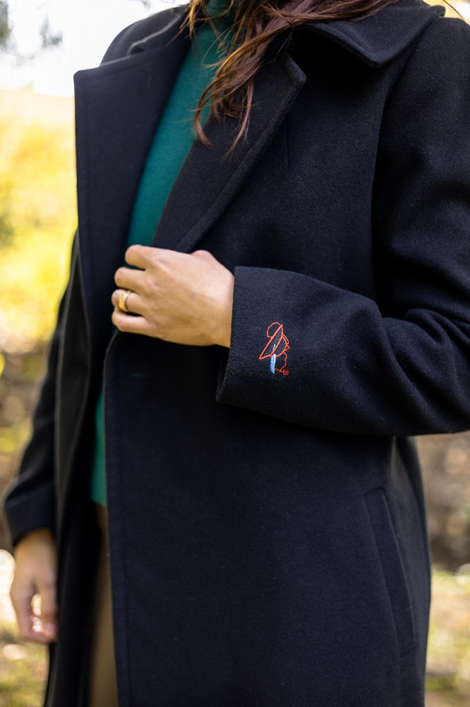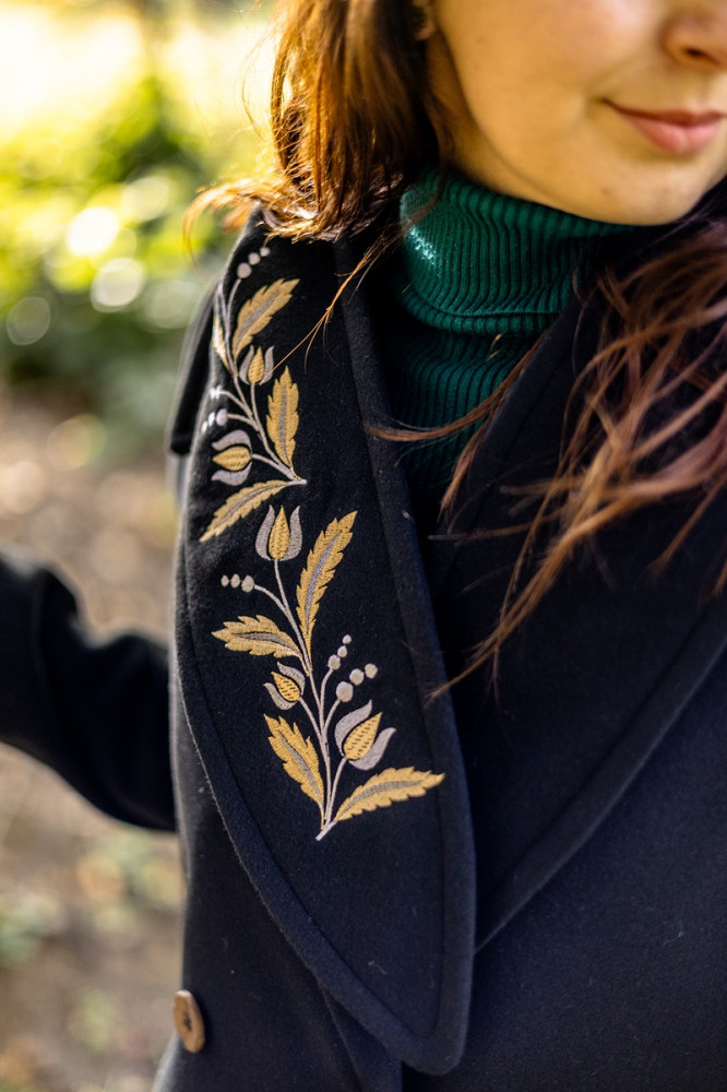 Jednoduchý elegantný kabát môžete doplniť obojstrannou kapucňou, ktorá je z jednej strany vyšívaná a z druhej čistá. Vďaka tomu môžete každý deň nosiť iný kabát.