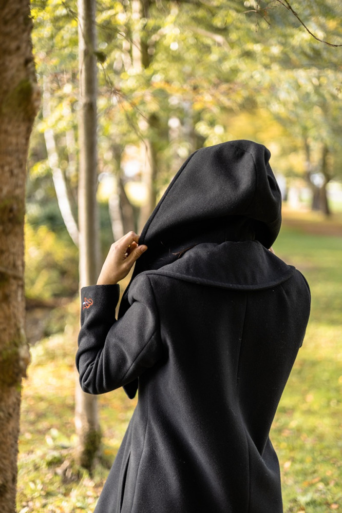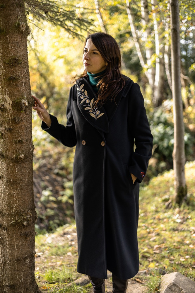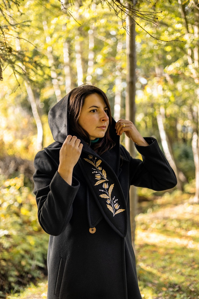 Zahaľte sa do tepla, štýlu a výnimočnosti. Tento dámsky čierny kabát Krojove.sk s osobitnou kapucňou je dokonalou kombináciou modernej elegancie a tradičných motívov. Vďaka kvalitnému materiálu a precíznemu spracovaniu sa stane vaším obľúbeným spoločníkom počas jesene aj zimy.