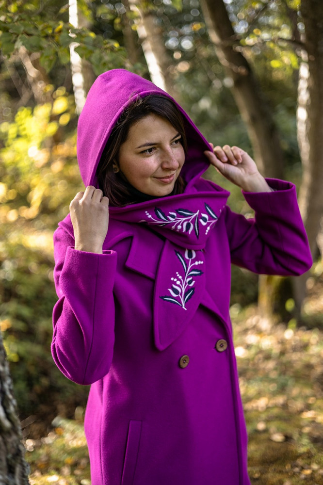 (Kabát s vyšívanou kapucňou si môžete objednať ako produkt s názvom Dlhý fuksiový kabát s vyšívanou odnímateľnou kapucňou)