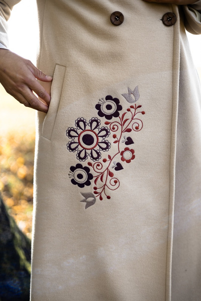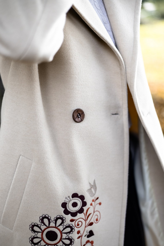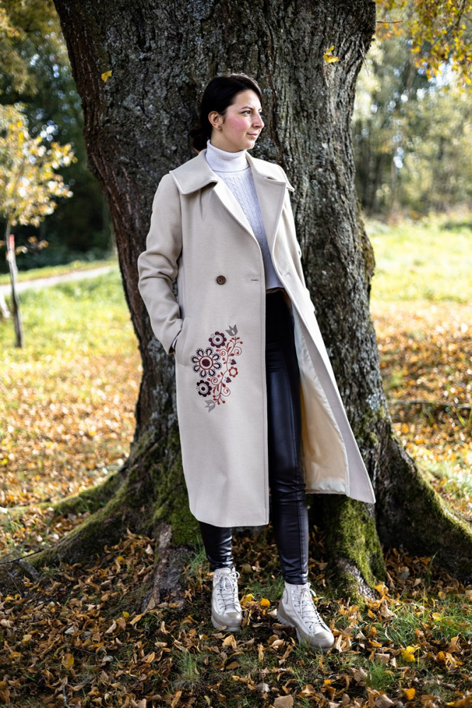 Zahaľte sa do tepla, štýlu a výnimočnosti. Tento dámsky béžový kabát Krojove.sk s výšivkou je dokonalou kombináciou modernej elegancie a tradičných motívov. Vďaka kvalitnému materiálu a precíznemu spracovaniu sa stane vaším obľúbeným spoločníkom počas jesene aj zimy.