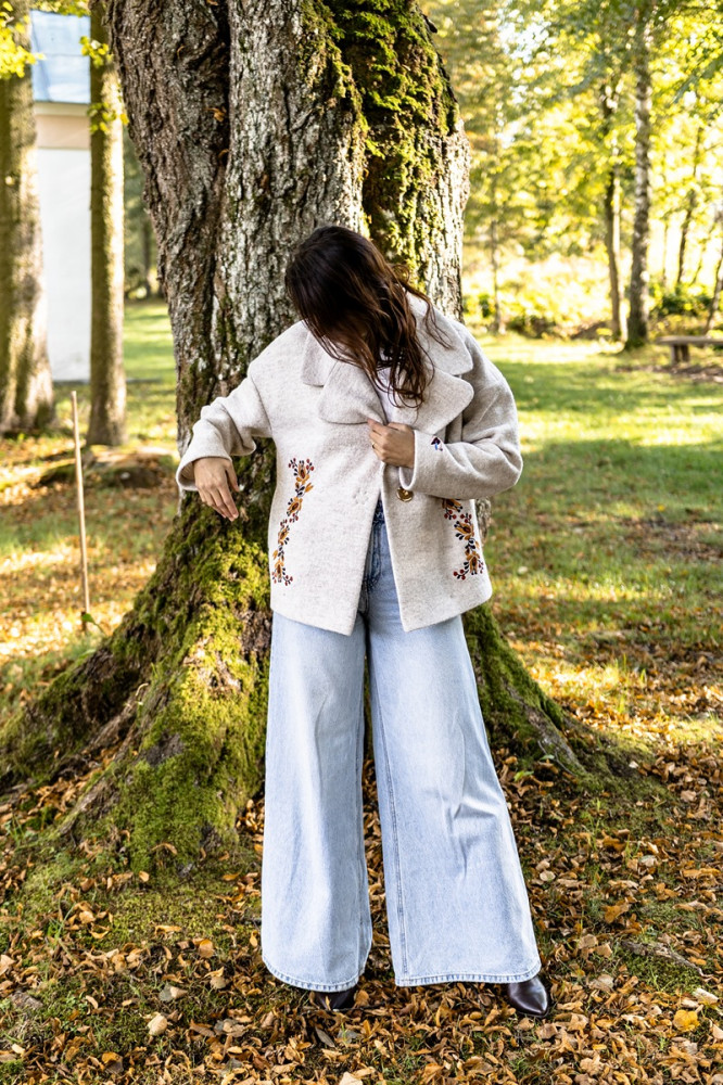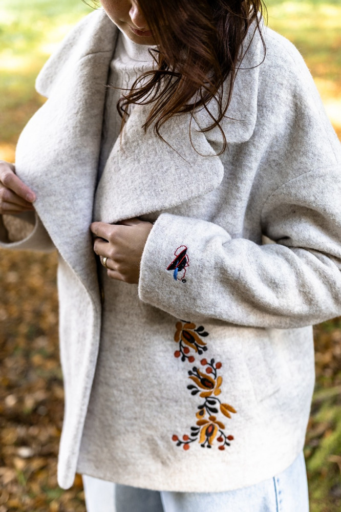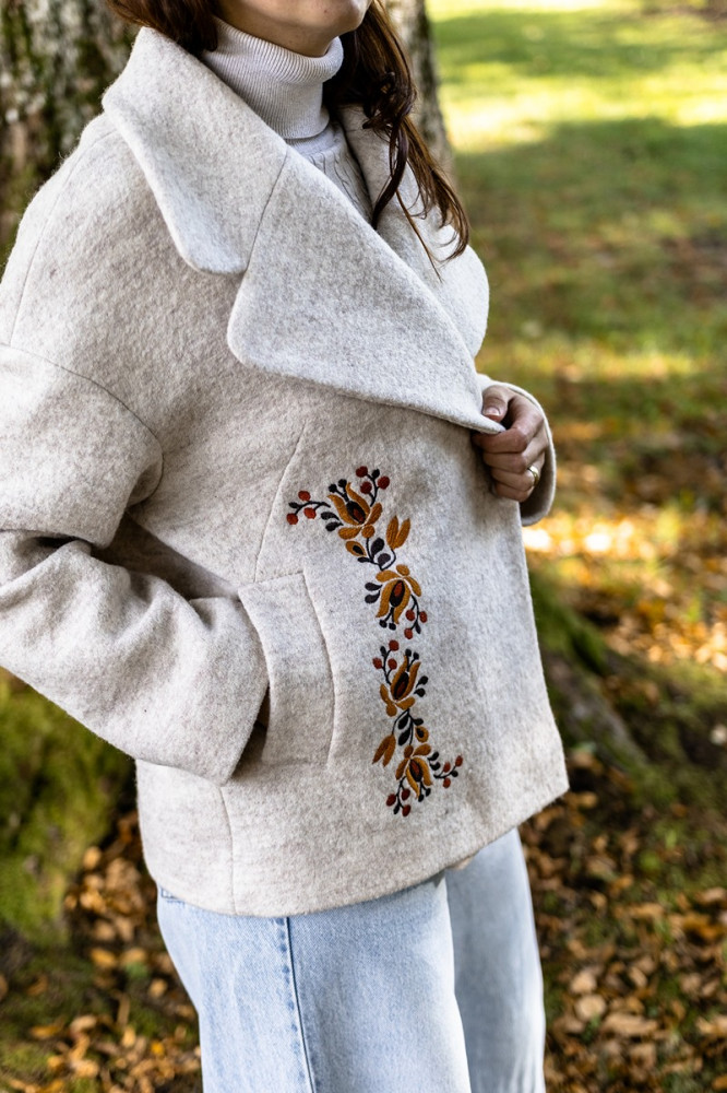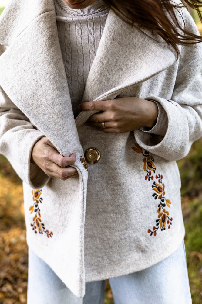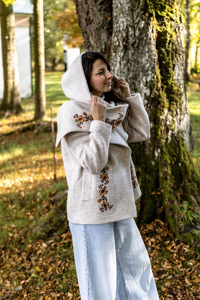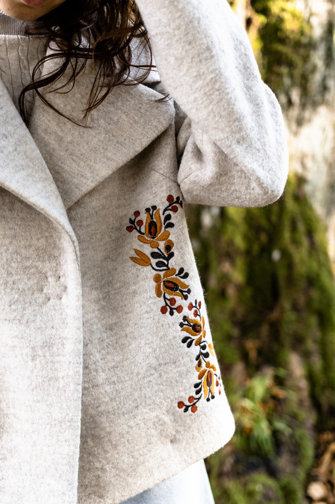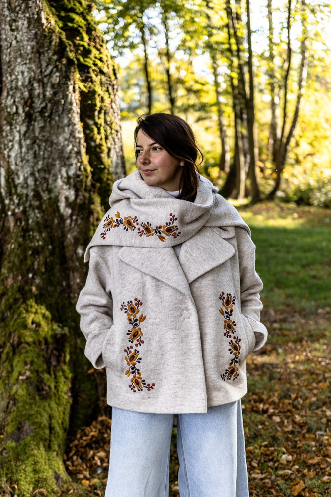 Objav nadčasový štýl s naším vlneným kabátikom s výšivkou a osobitnou kapucňou značky Krojove.sk, ktorý spája eleganciu, pohodlie a remeselnú kvalitu. Tento jemne krémový kúsok s vyšívanými detailmi dodá tvojmu outfitu jedinečný šarm.