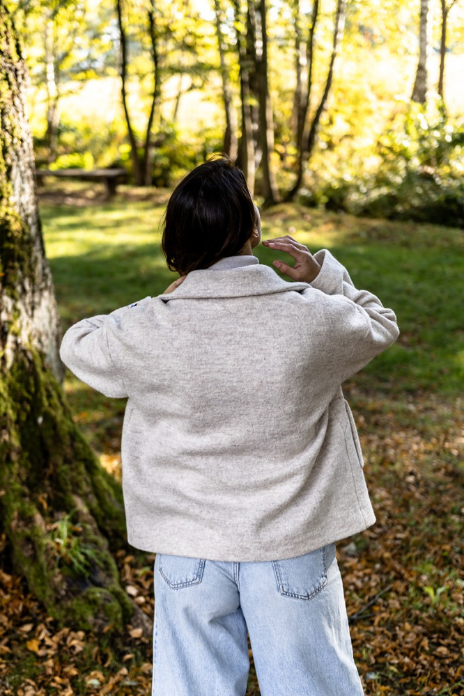 Kabátik má voľnejší strih a široký golier, vďaka čomu pôsobí žensky a ležérne zároveň. Vyrobený je zo 100% vlny, ktorá príjemne zahreje a udrží tvar aj po dlhom nosení.
