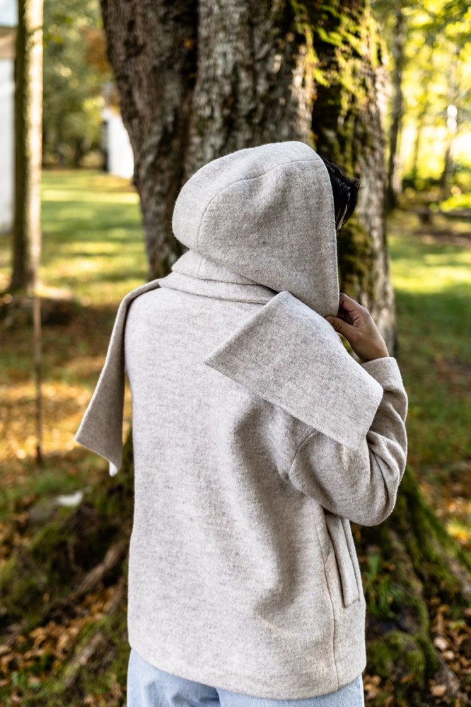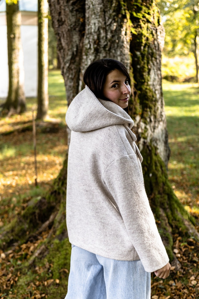 Jednoduchý elegantný kabát môžete doplniť obojstrannou kapucňou, ktorá je z jednej strany vyšívaná a z druhej čistá. Vďaka tomu môžete každý deň nosiť iný kabát.
