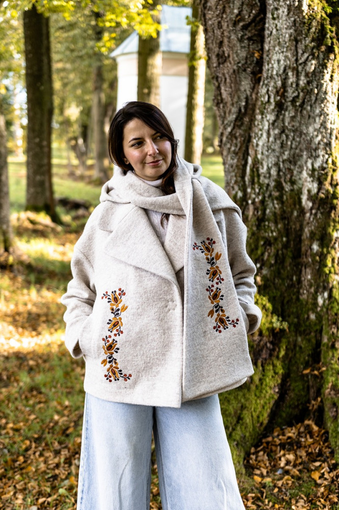 Objav nadčasový štýl s naším vlneným kabátikom s výšivkou Krojove.sk, ktorý spája eleganciu, pohodlie a remeselnú kvalitu. Tento jemne krémový kúsok s vyšívanými detailmi dodá tvojmu outfitu jedinečný šarm.