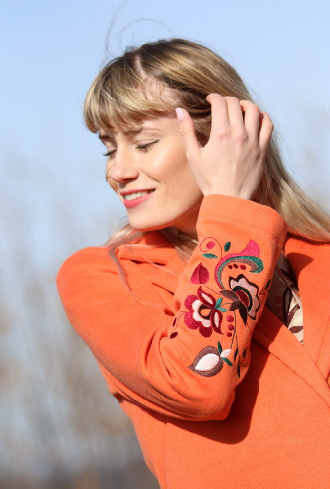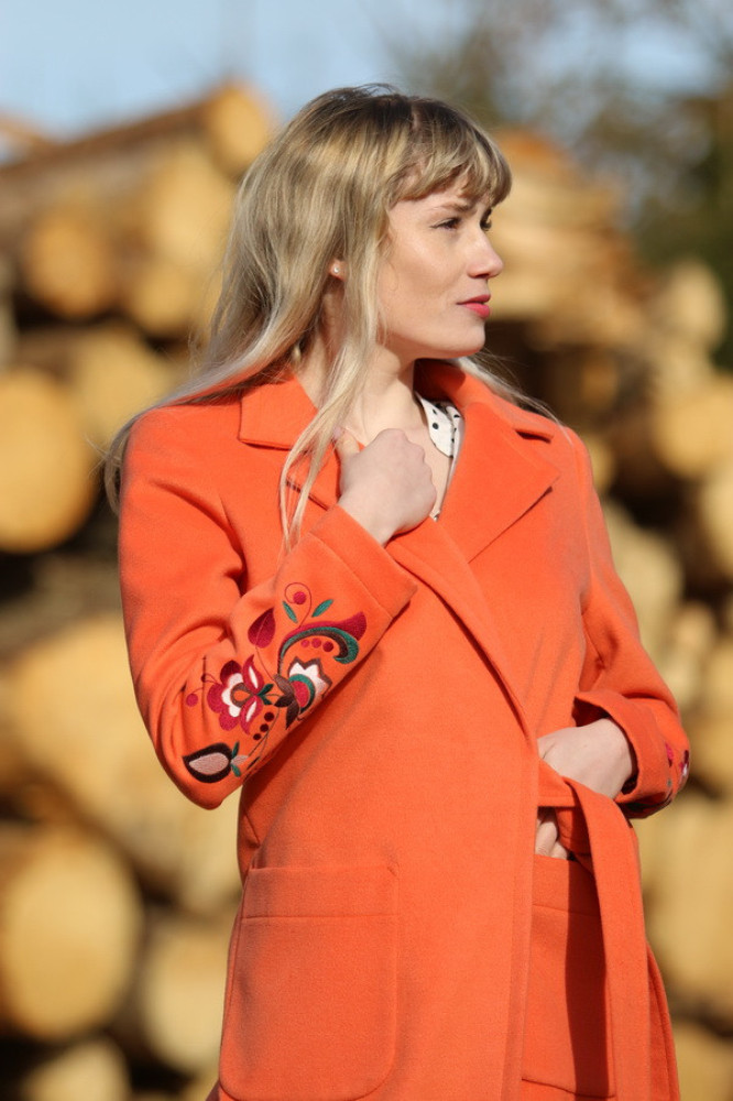 Kvalitne spracovaný vyšívaný kabátik nadčasového oversize klasického rovného strihu. Má všitý opasok so zaväzovaním na bočnej strane, dĺžku po kolená a fazónku, ktorá ho robí zároveň aj elegantným. Je vhodný do prechodného obdobia jar/jeseň. Na prednej strane má všité 2 hlboké vrecká. Je vhodný pre dámy, ktoré nechcú splynúť v dave.