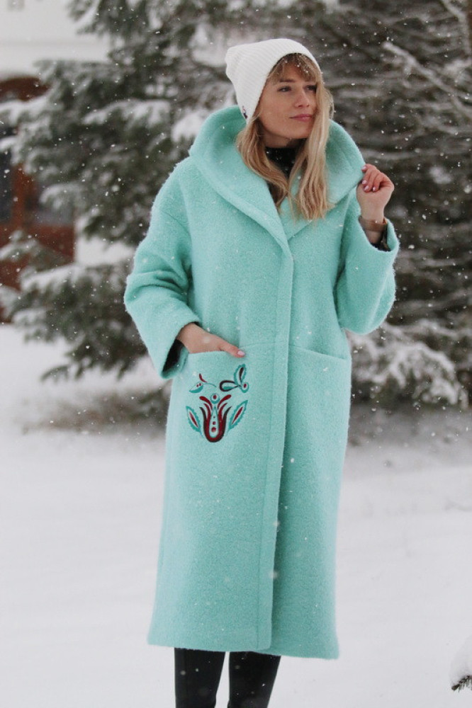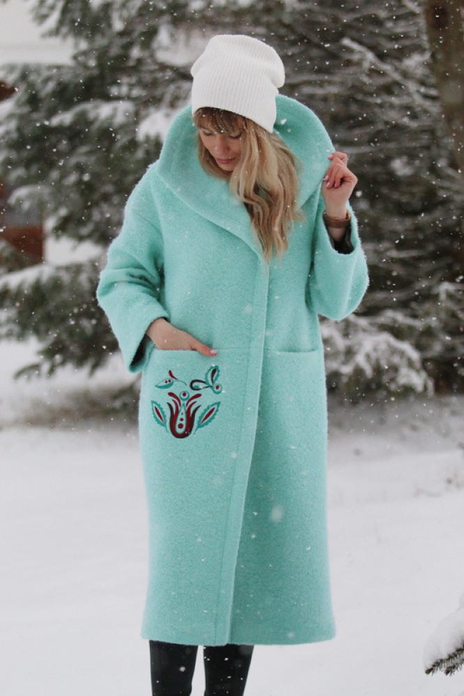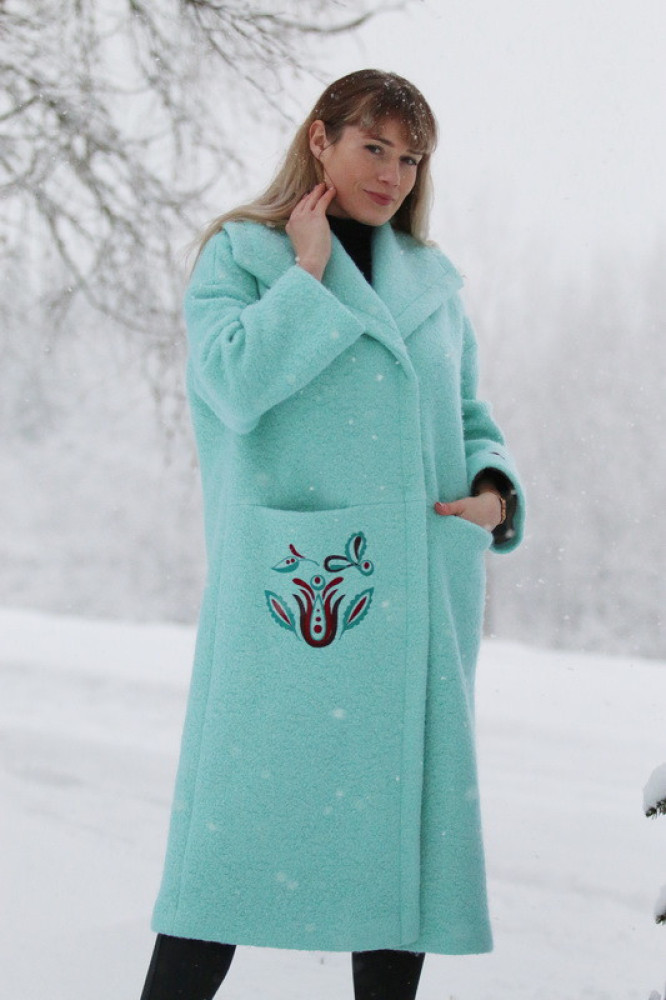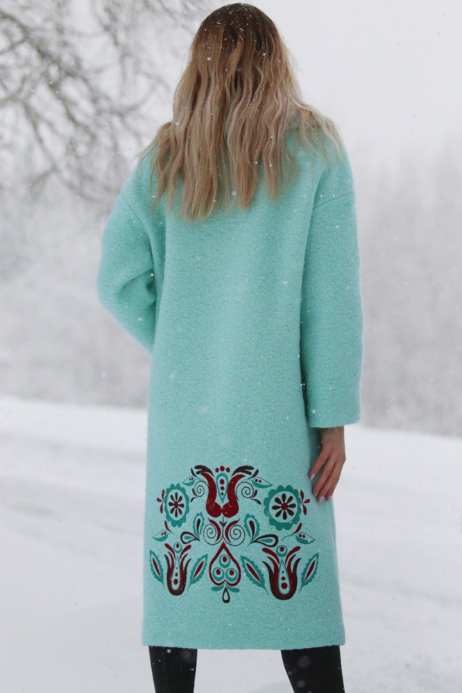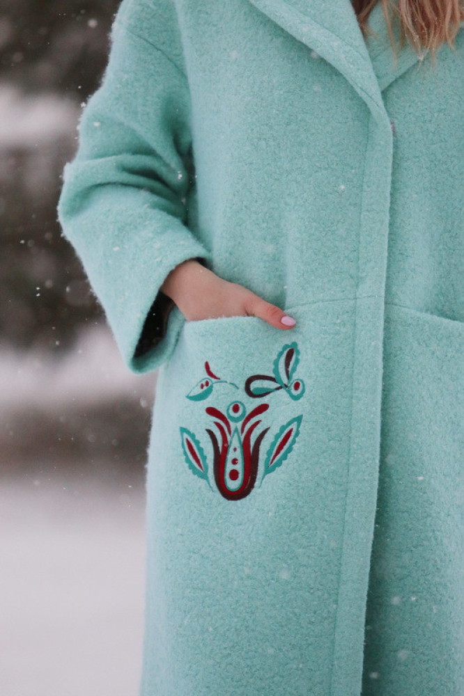 Kabátik pod kolená je vhodný do chladného počasia zima/jeseň. Pri nosení udržiava príjemné teplo. Je výnimočný svojim neodmysliteľným golierom, ktorý pridáva na elegancii celkového vzhľadu. Na prednej strane má všité 2 hlboké vrecká. Zdobí ho nádherná výšivka na vreckách a jedinečnosť mu dáva svieža tyrkysová farba. Iba jeden kus originál.