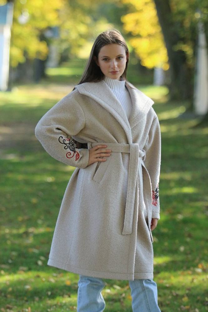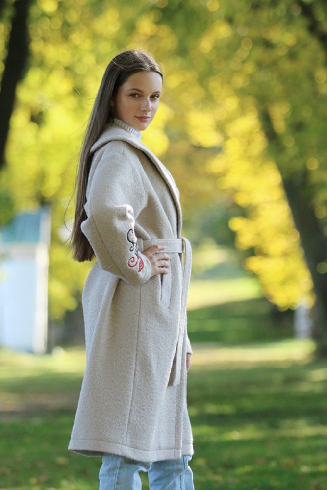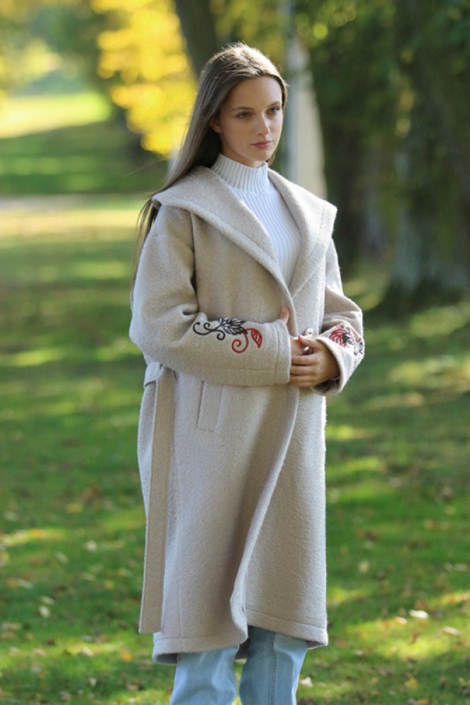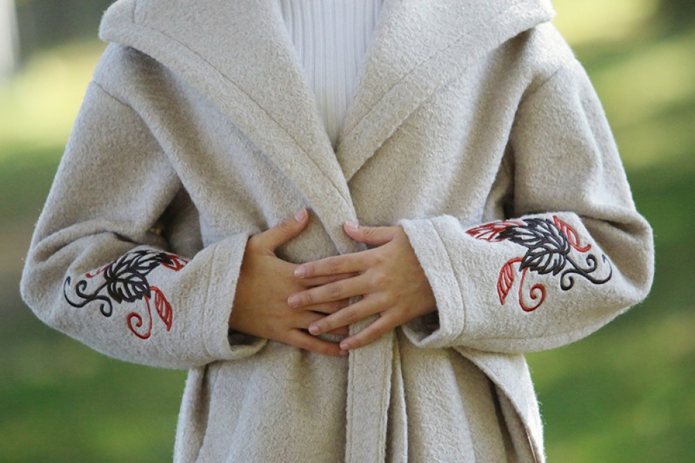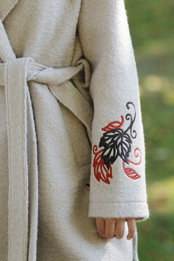Jedinečný detail: Rukávy zdobí luxusná, precízna výšivka, ktorá dodáva kabátu nezameniteľný a originálny charakter. Opasok v páse umožňuje zvýrazniť siluetu. Ideálna voľba pre ženu, ktorá hľadá teplo, kvalitu a jedinečný dizajn.