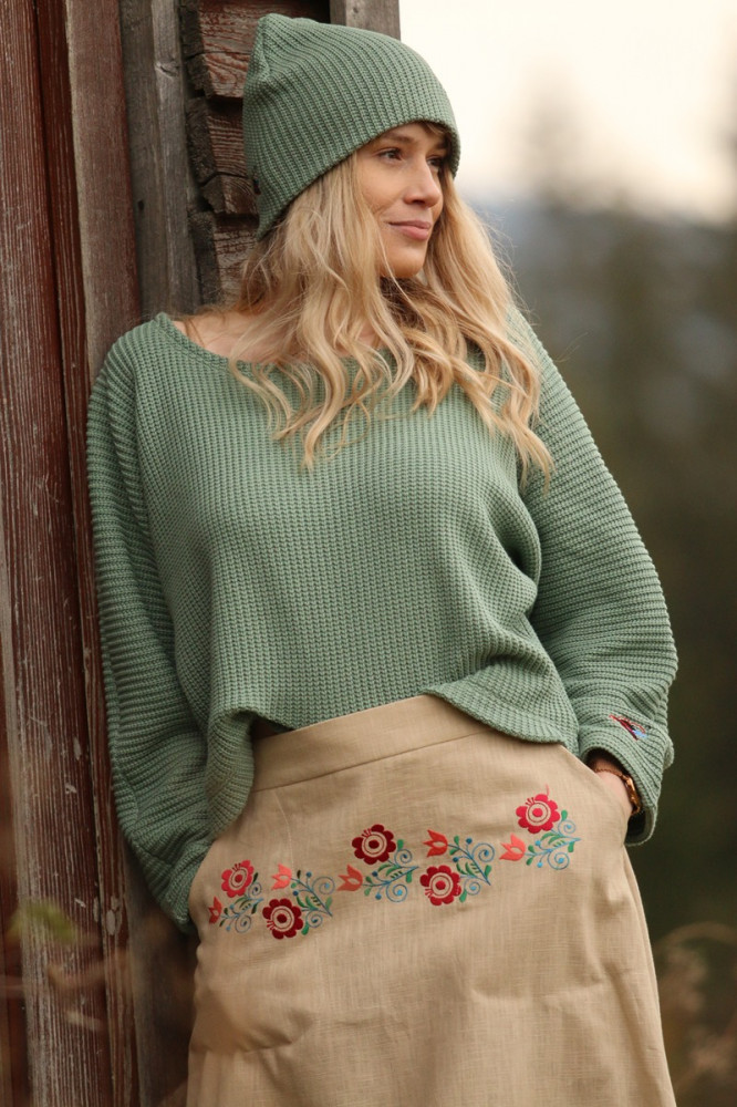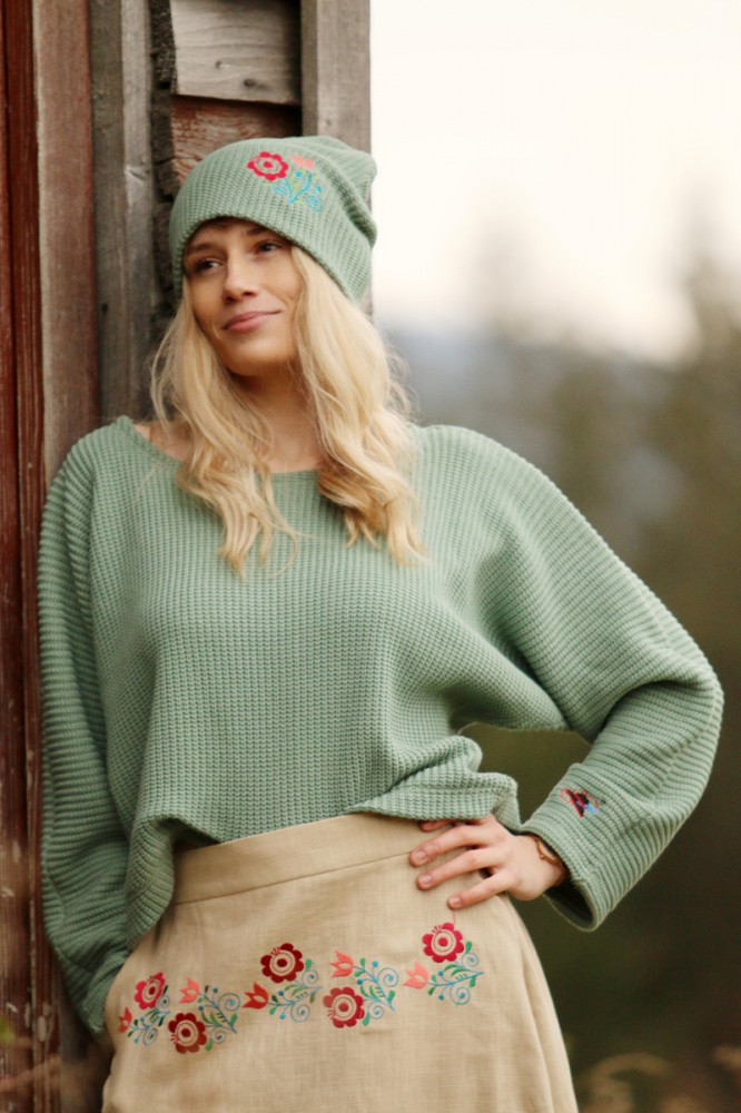 Vyšívaná bavlnená čiapka je vhodná na prechodné obdobie jeseň/zima. Hrejivá, príjemná na dotyk, šetrná k vlasom.
