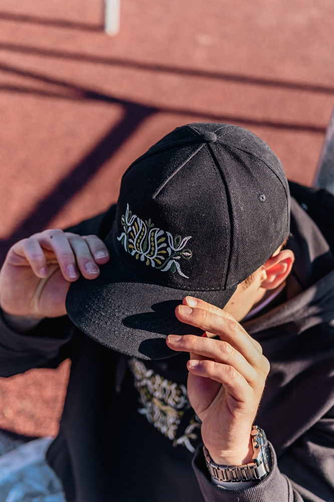 Hľadáte štýlový doplnok s nádychom tradície? Táto čierna šiltovka s ľudovou výšivkou spája moderný urban štýl a slovenské folklórne motívy.