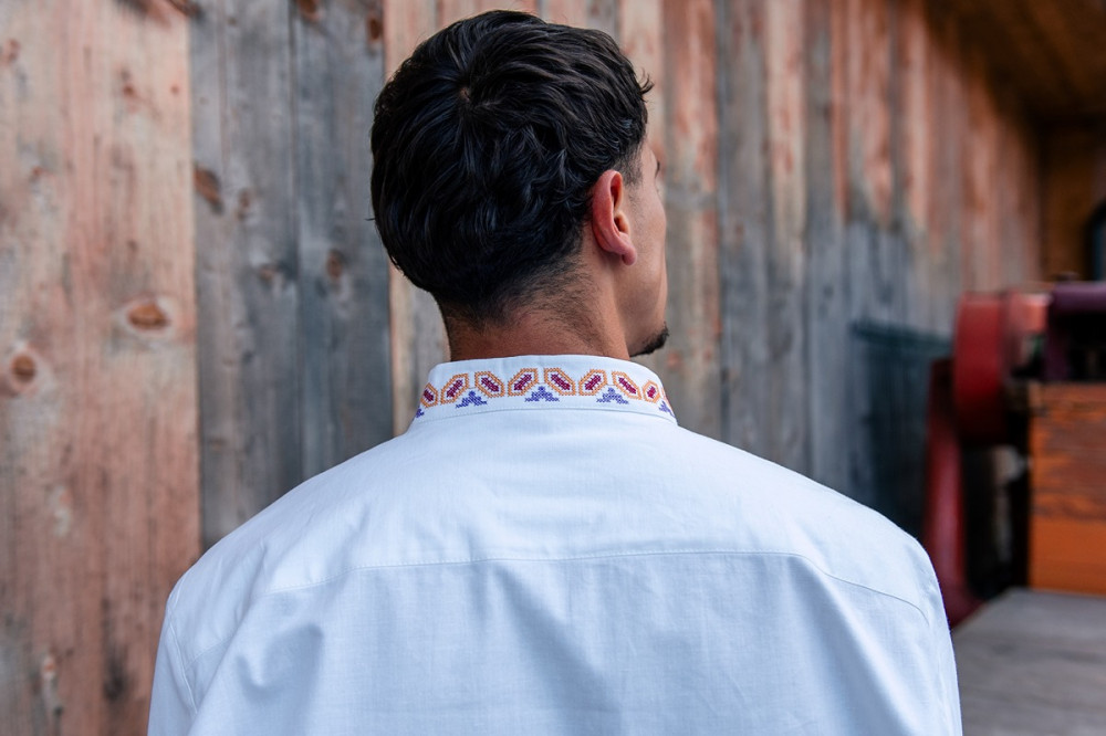 Tradičná pánska bavlnená košeľa Krojove.sk s jemnou výšivkou v oblasti hrude, na stojačiku a na manžetách.