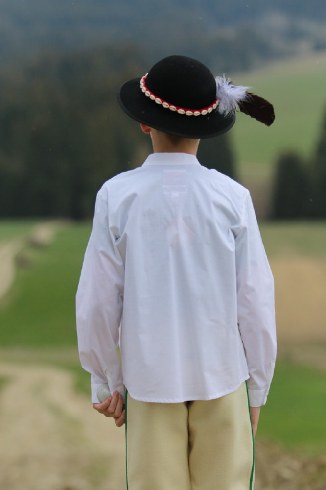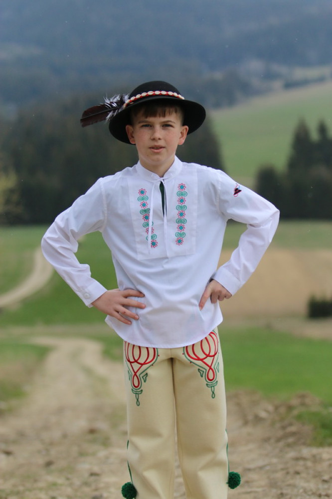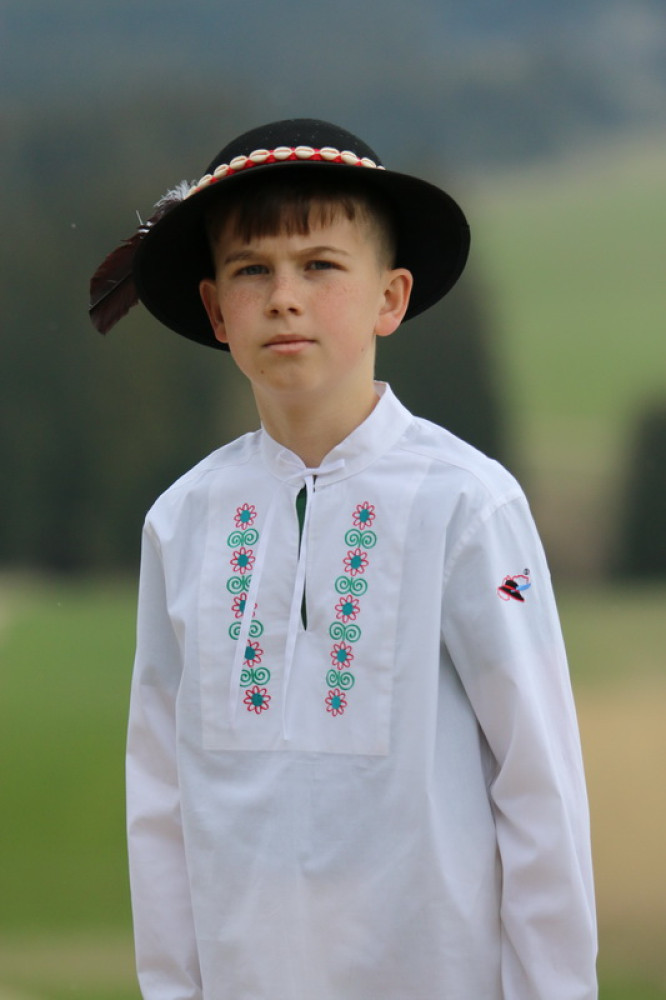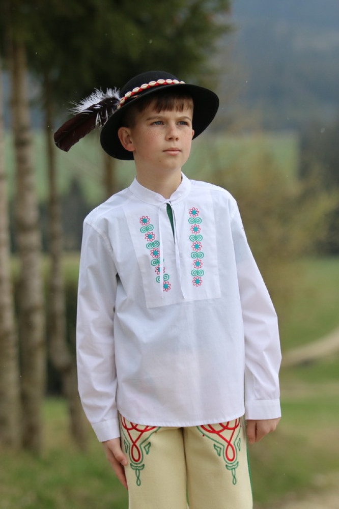 Chlapčenská vyšívaná košeľa s ľudovým motívom so stojačikom a šnúrkami na zaviazanie, s dlhým rukávom ukončeným manžetou. Košeľa je príjemná na dotyk, šetrná k pokožke.