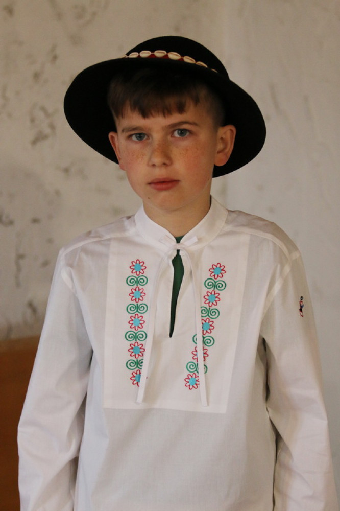 Chlapčenská vyšívaná košeľa s ľudovým motívom so stojačikom a šnúrkami na zaviazanie, s dlhým rukávom ukončeným manžetou. Košeľa je príjemná na dotyk, šetrná k pokožke.