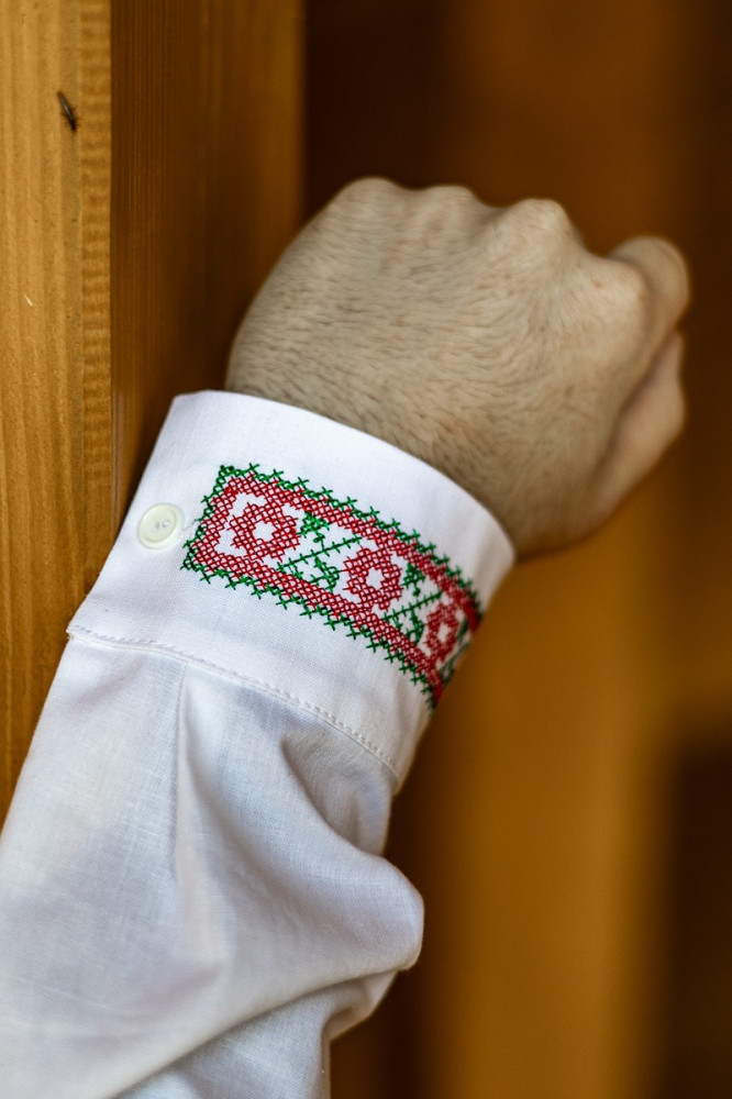 Tradičná pánska folklórna ľanová košeľa Krojove.sk s jemnou výšivkou v oblasti hrude, na stojačiku a manžetách.