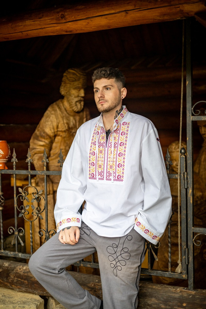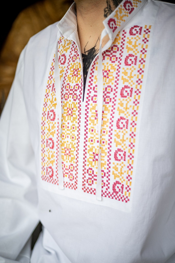 Tradičná pánska folklórna bavlnená košeľa Krojove.sk s rastlinnou krížikovou výšivkou v oblasti hrude, na stojačiku a rukávoch.