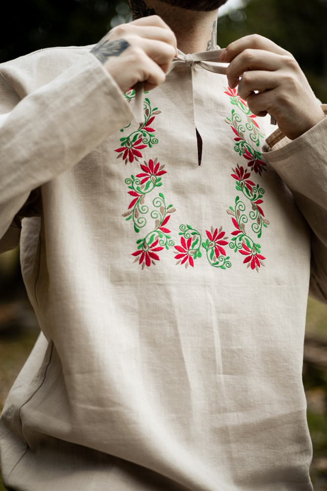 Tradičná pánska folklórna ľanová košeľa Krojove.sk s jemnou výšivkou v oblasti hrude.