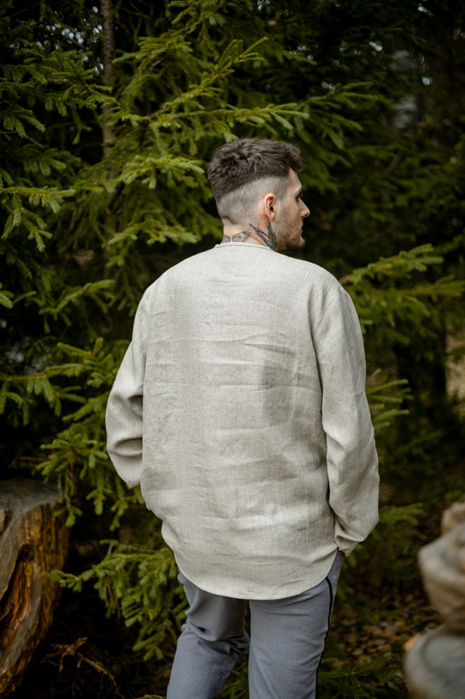 Tradičná pánska folklórna ľanová košeľa Krojove.sk s jemnou výšivkou v oblasti hrude.