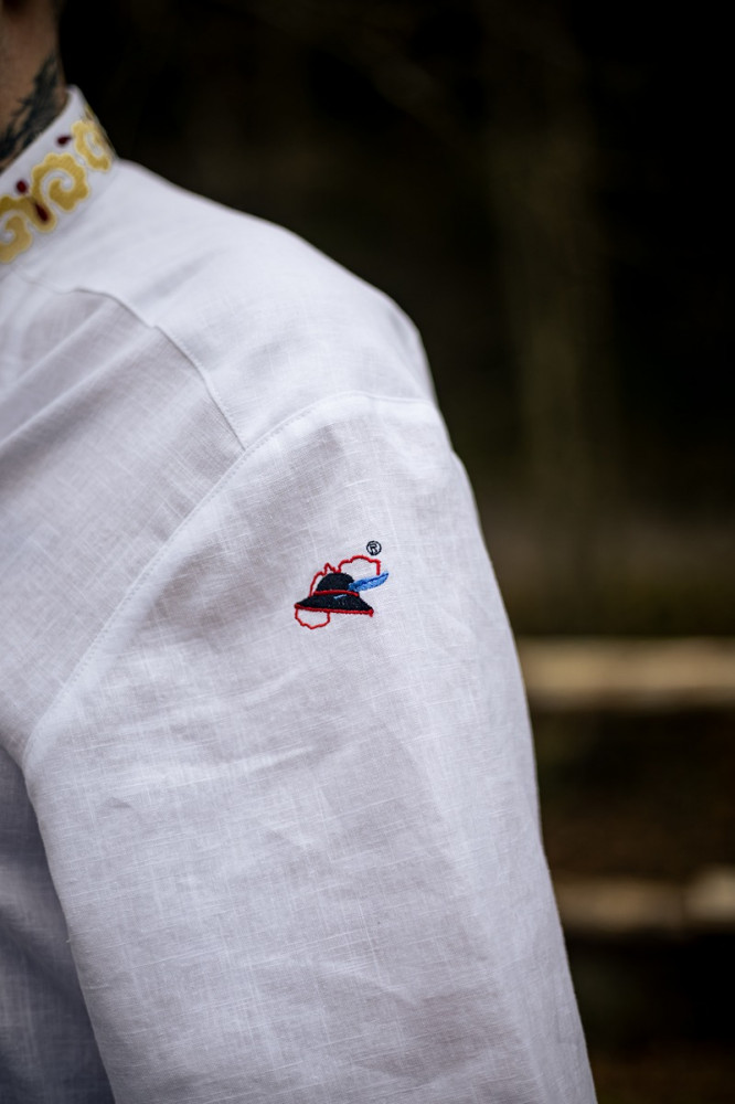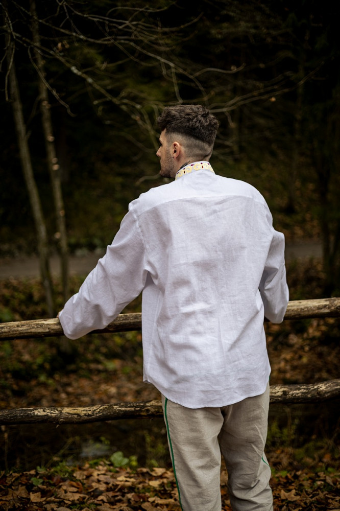 Tradičná pánska folklórna bavlnená košeľa Krojove.sk s jemnou výšivkou v oblasti hrude a na stojačiku.