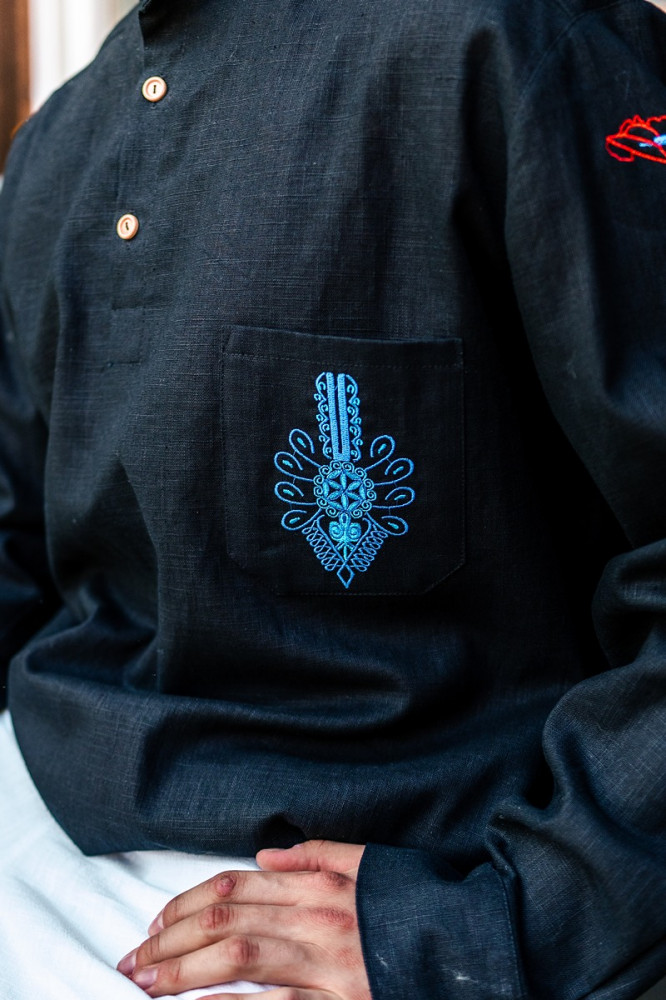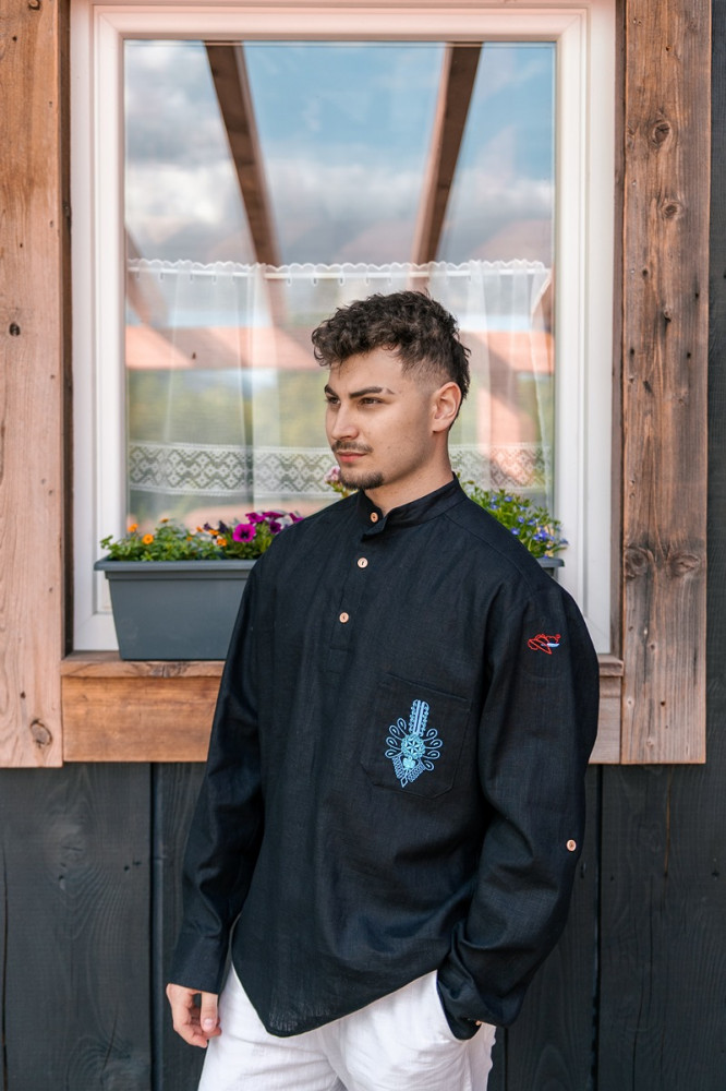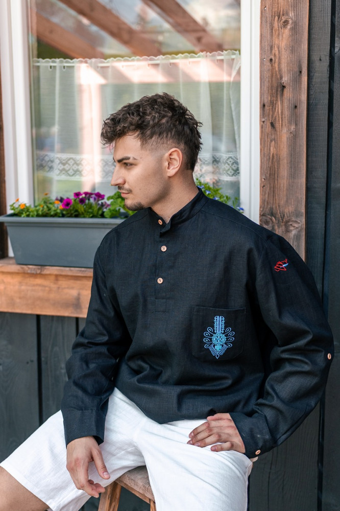 Na vrecku košele sa nachádza jemná výšivka, ktorá pridáva na originalite a kultúrnej hodnote. Klasický ľanový materiál je priedušný a príjemný na telo, čo zabezpečuje komfort počas celého dňa.