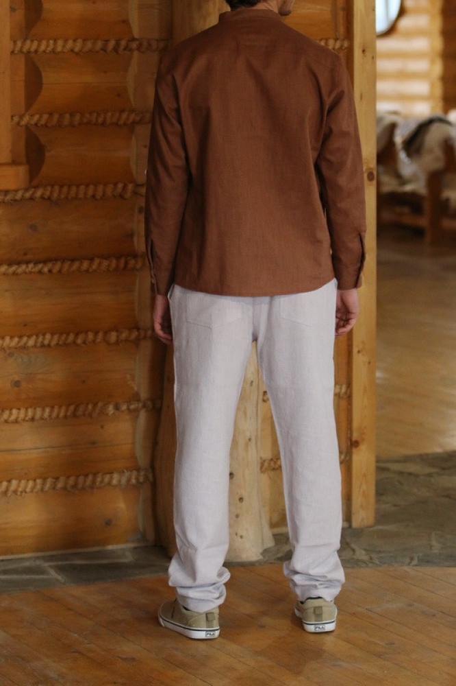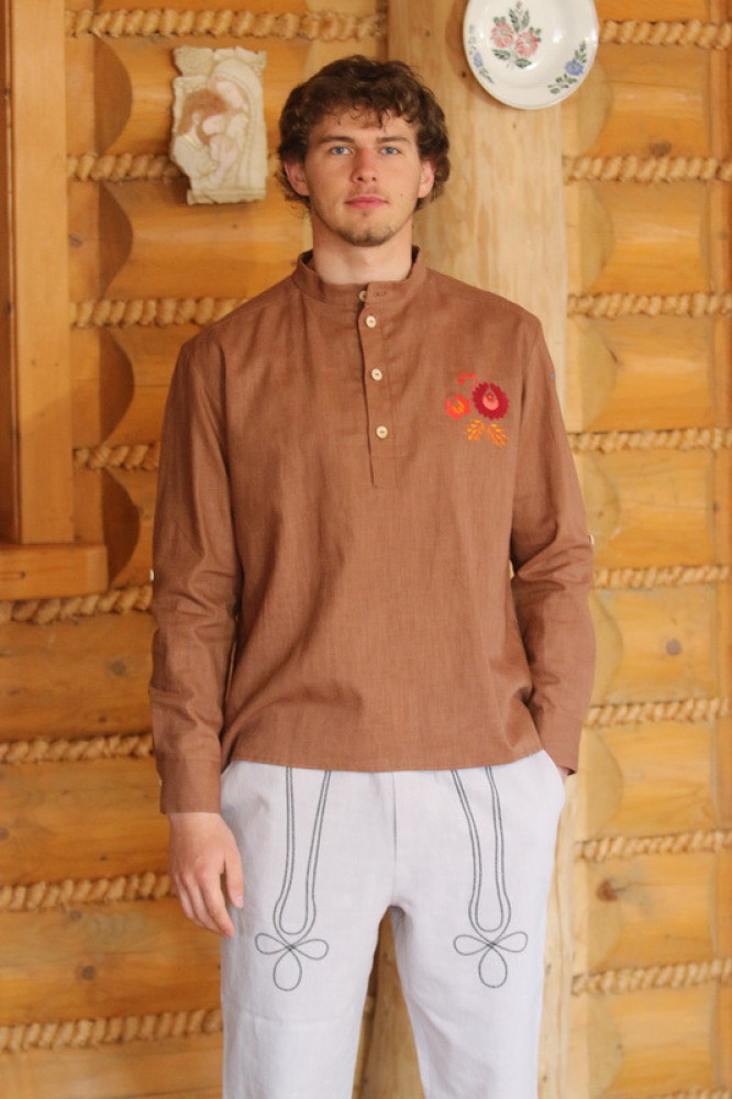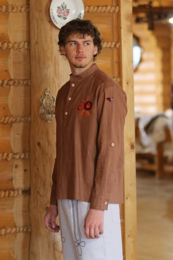 Pánska vyšívaná košeľa so stojačikom na legu s drevenými gombičkami, jemne trendy slimového strihu s dlhým rukávom ukončeným manžetou, ktorý sa dá vypnúť na 3/4 dĺžku. Košeľa je príjemná na dotyk, šetrná k pokožke, vhodná pre všetky vekové kategórie.