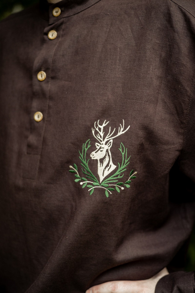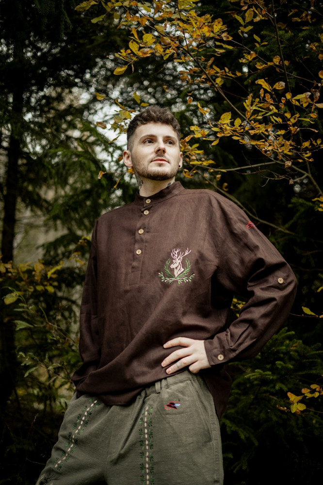 Košeľa je inšpirovaná lesnými motívmi a remeselnou zručnosťou našich predkov. Vyznačuje sa jednoduchým, pohodlným strihom a decentnými farebnými motívmi.
