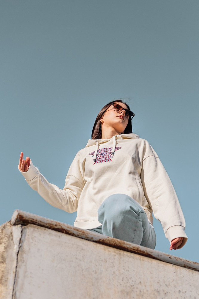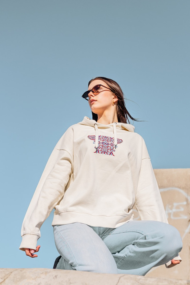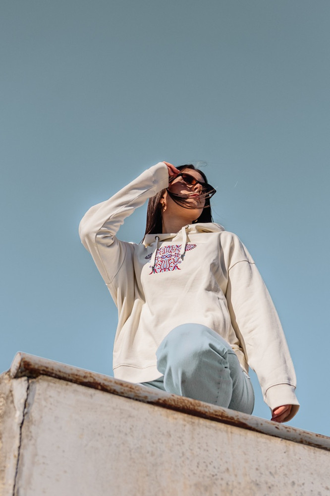 Dominantou mikiny je starostlivo vyberaná slovenská výšivka inšpirovaná ľudovým folklórom. Každý motív je precízne spracovaný technikou vysokokvalitnej strojovej výšivky, ktorá si zachováva svoj tvar, farby a detail aj po mnohých praniach.