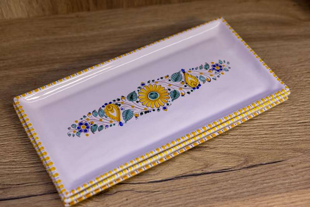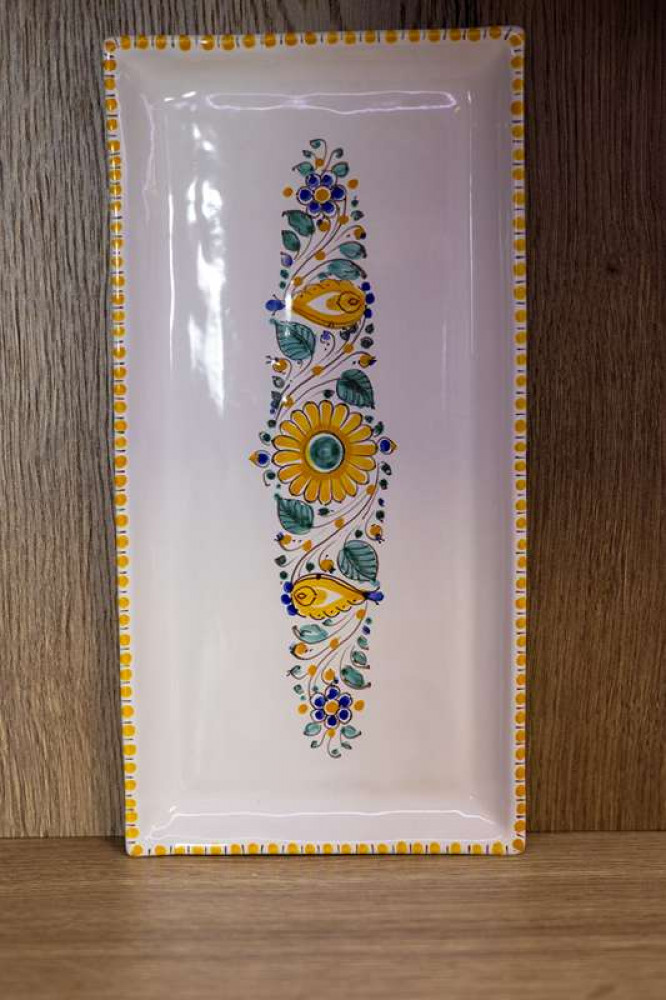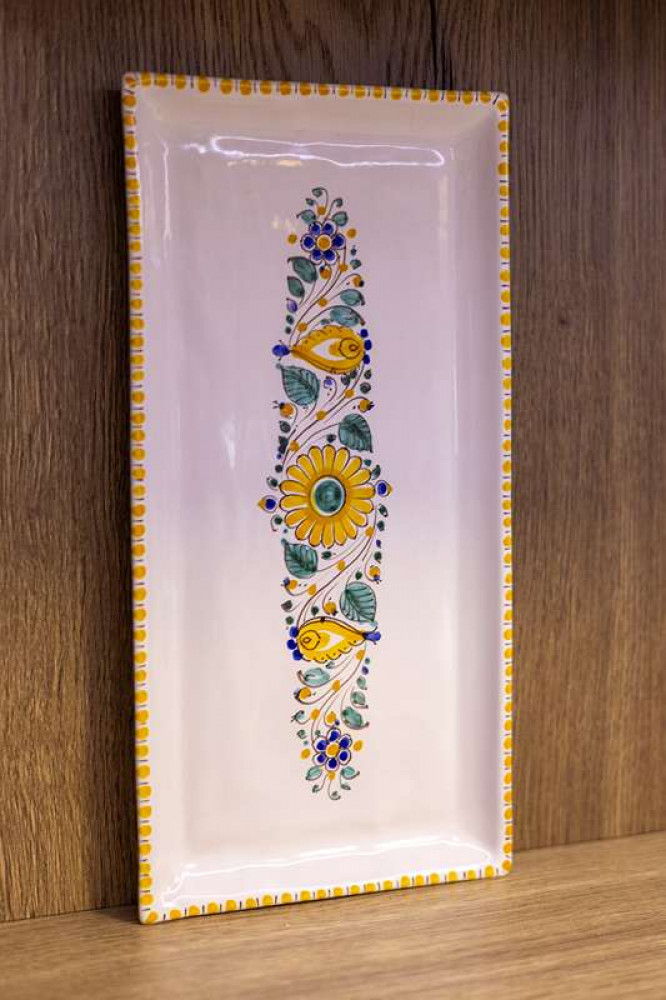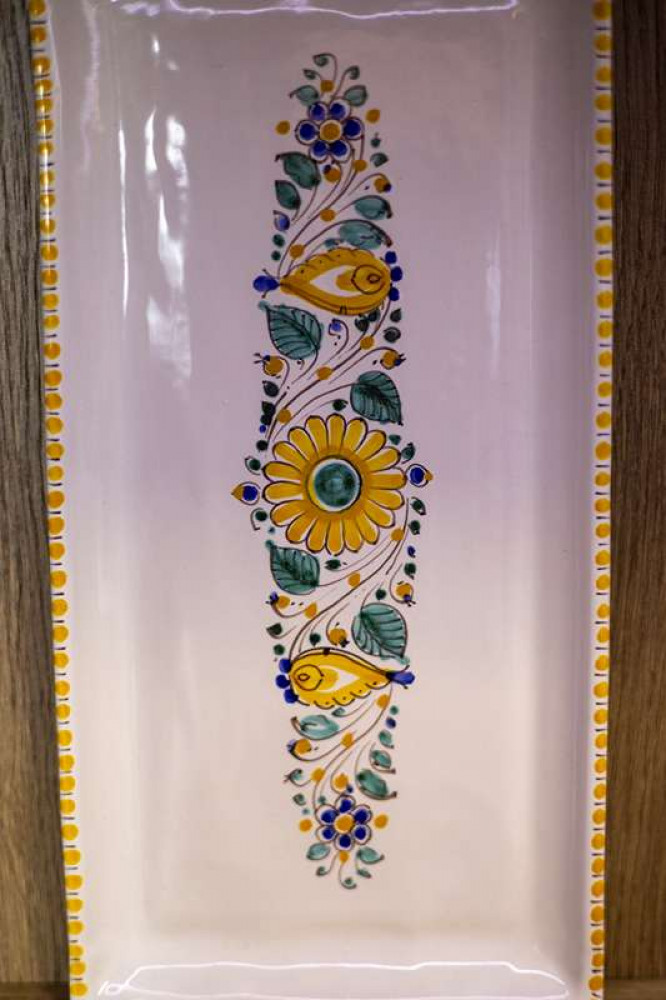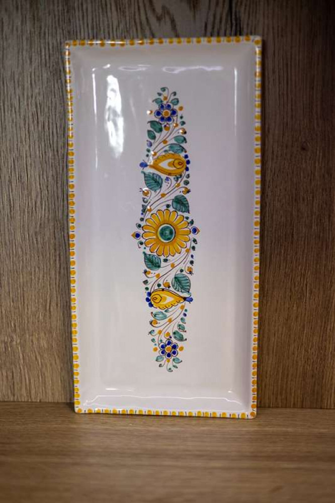 Maľovaný keramický podnos je elegantný a ručne vyrobený kúsok, ktorý kombinuje umeleckú hodnotu a praktickú funkčnosť. Je vyrobená z kvalitnej keramiky, ktorá je po vypálení zdobená detailnými maľbami, čím každý kus získava svoj jedinečný charakter. Dizajn môže byť inšpirovaný rôznymi motívmi – od tradičných kvetinových a geometrických vzorov až po modernejšie abstraktné či folklórne motívy.