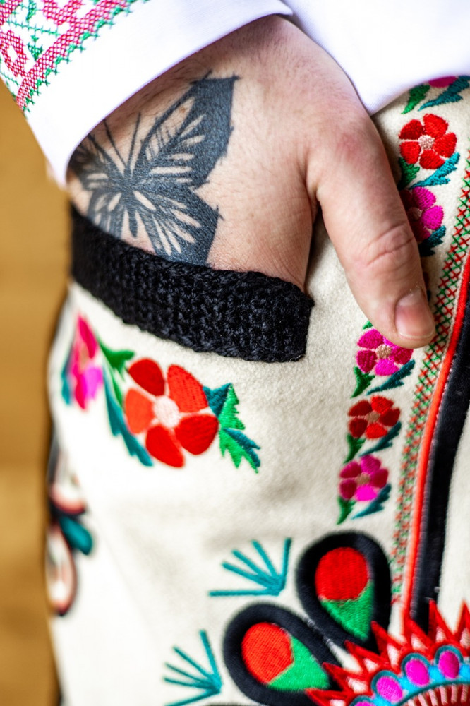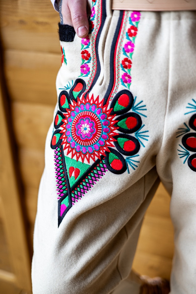 Tradičné pánske goralské súkenné nohavice s bohatou výšivkou sú originálnym kúskom, ktorý nesie ducha slovenského dedičstva. Vyrobené z kvalitného súkna, poskytujú pevnosť, teplo a zároveň pohodlie pri nosení. Precízna výšivka v žiarivých farbách – červená, zelená, modrá a ružová – odkazuje na tradičné motívy z horských oblastí Slovenska.